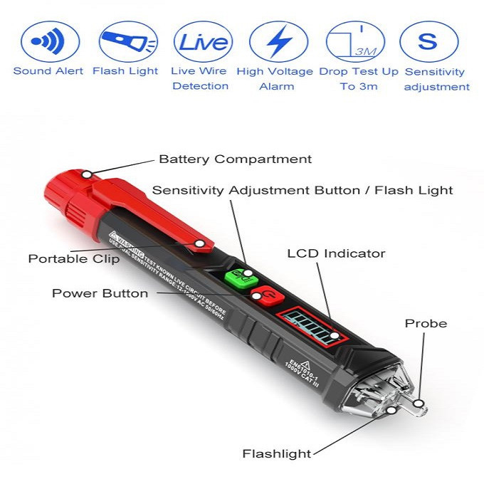 فرکانس 50/60Hz دارای دو سطح حساسیت: 12~1000V / 48~1000V میزان مصرف کم باتری دارای چراغ قوه دارای قابلیت خاموش شدن خودکار