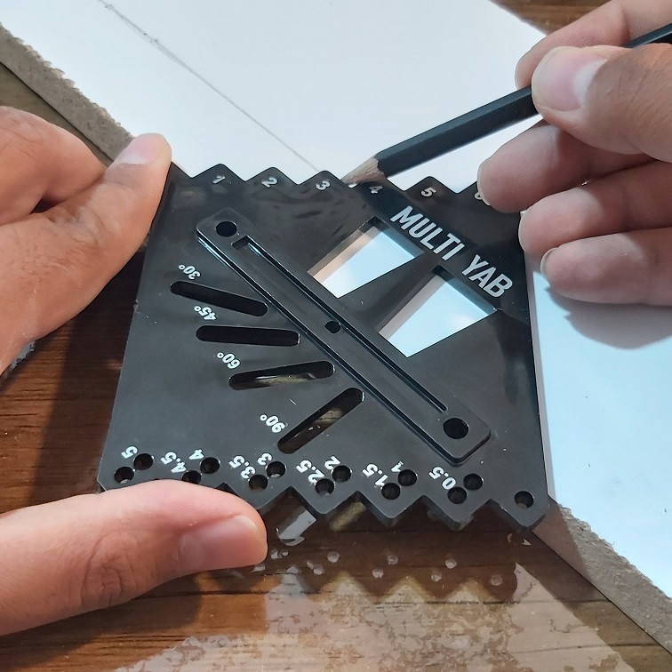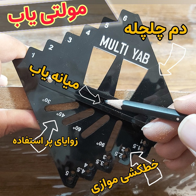 در مشاغلی مانند نجاری ، کابینت کاری و همچنین کاشی و سرامیک کاری یکی از نکاتی که همیشه مورد توجه می باشد دقیق بودن اندازه گذاری هاست ، شابلون مولتی یاب دقیقا در جهت همین موضوع طراحی و ساخته شده است ، همانطور که از نام این ابزار پیداست کاربرد های متفاوتی را در خود جای داده است که از قبیل : 1- شابلون میانه یاب قطعات 2- شابلون اتصال دم چلچله در دو حالت 3- شابلون خطکشی موازی با دو دقت 1 سانتی متر و 5 میلیمتر در طرفین ابزار و 4- شابلون زوایای پر استفاده 30 و 45 و 60 و 90 درجه می باشد