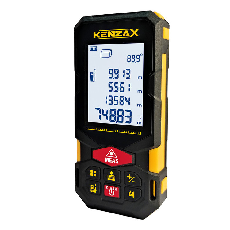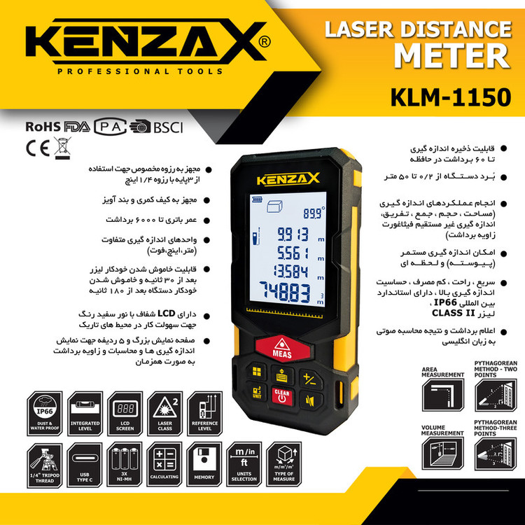 لیزر ابزاری است که نور را به صورت پرتوهای موازی بسیار باریکی که طول موج مشخصی دارند ساطع میکنند. این دستگاه از مادهای جمعکننده یا فعالکننده نور تشکیل شده که درون محفظه تشدید نور قرار دارد. این ماده پرتو نور را که به وسیله یک منبع انرژی بیرونی (از نوع الکتریسیته یا نور) به وجود آمده، تقویت میکند .با توجه به دقت استفاده از تکنوژِی لیزر در صنایع مختلفی از جمله پزشکی ، اندازه گیری ، هسته ای و حتی صنایع نظامی مورد توجه و بکار گرفته میشود. اندازهگیری فاصله به وسیله متر لیزری همواره دقیقترو آسانتر از اندازهگیری با مترهای معمولی است. در محل های مرتفع ، عمیق و مکان هایی که امکان اندازهگیری فاصله با متر دستی وجود ندارد، یا زمانی که بخواهیم فاصله بین دو کنج را اندازه گیری نماییم نیز متر لیزری کاربرد حرفه ای تری دارد . استفاده از متر لیزری میتواند بهراحتی مشکل را حل کند. متر لیزری کنزاکس (KENZAX) مدل KLM-1150 یکی از محصولات با کیفیت این شرکت بزرگ در زمینه تولید ابزارهای اندازه گیری لیزری می باشد. نوع لیزراستفاده شده از کلاس II است .پیشتر از محصولات ابزار دقیق کنزاکس با ترازهای لیزری آن در دیجی کالا آشنا شده بودید. وزن این محصول 117 گرم و ابعاد آن 112 × 52 × 32 میلیمتر است. دامنهی اندازهگیری این کالای پرکاربرد، 80 متر و دقت این مسافت یابی نیز 1± میلیمتر است. همچنین از قابلیت های نرم افزاری دیگر متر لیزری کنزاکس میتوان به محاسبه سطح ، حجم و زاویه در اندازه گیری اشاره نمود . از ویژگیهای دیگر این محصول عبارت است از: قابلیت خاموششدن خودکار، قابلیت ذخیرهی 60 دادهی آخر اندازهگیریشده یا محاسبه شده، داشتن استاندارد IP66 (مقاومت دربرابر آب و گردوغبار)، قابلیت خاموششدن خودکار پرتو لیزر پس از 30 ثانیه، قابلیت خاموششدن دستگاه پس از 180 ثانیه و قابلیت اندازهگیری پیوسته، مینیمم، ماکزیمم، جمع و تفریق و فیثاغورث دو و سهنقطهای.جهت تأمین انرژی KLM-1150 از سه عد باتری نیمقلمی 1.2ولت قابل شارژ استفاده مینماید . صفحه نمایش KLM-1150 بزرگ ، دارای پنج ردیف مستقل و نور سفید جهت سهولت کار در محیط های تاریک میباشد . متر لیزری کنزاکس مجهز به کیف کمری و بند آویز است . از سایر امکانات KLM-1150 میتوان به قابلیت شارژ از طریق درگاه USB TYPE C ، اندازه گیری پیوسته و لحظه ای اشاره نمود