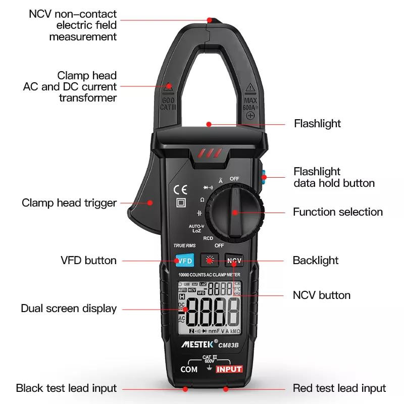 اندازه گیری ولتاژ AC/DC، جریان AC، مقاومت، ظرفیت خازن، فرکانس، چرخه کاری، دیود، تداوم و سیم برق و تست NCV با عملکرد هشدار خاموش شدن خودکار: حدود 15 دقیقه چراغ قوه LED داخلی، مناسب برای استفاده در شب یا محیط تاریک دهانه فک: 30 میلی متر