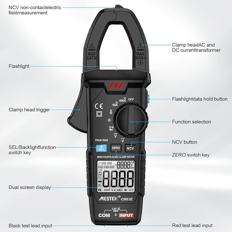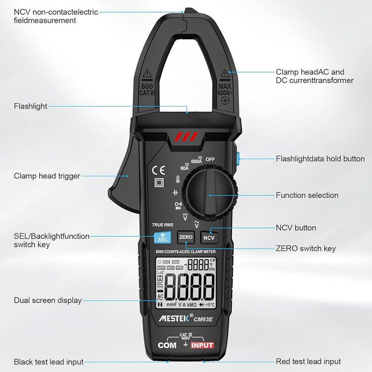 اندازه گیری ولتاژ AC/DC، جریان AC/DC، مقاومت، ظرفیت خازن، فرکانس، چرخه کاری، دیود، تداوم و سیم برق و تست NCV با عملکرد هشدار خاموش شدن خودکار: حدود 15 دقیقه چراغ قوه LED داخلی، مناسب برای استفاده در شب یا محیط تاریک دهانه فک: 30 میلی متر
