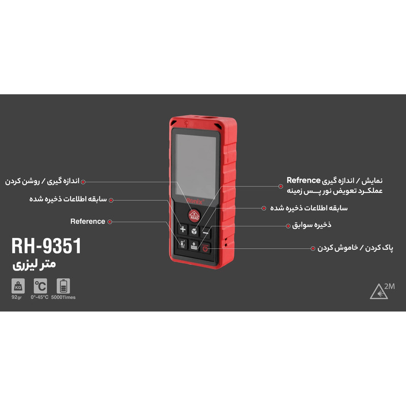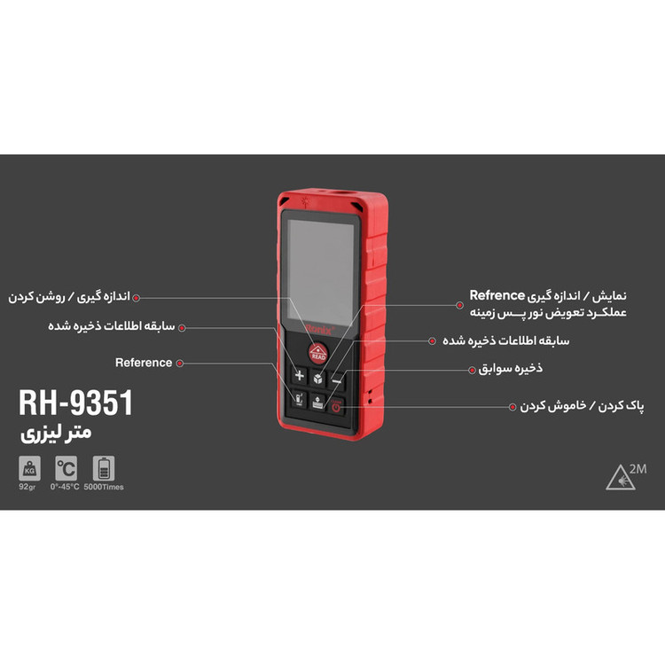 Class 2 , باتری نیمقلمی , صفحه نمایش 4خطی , قابلیت اندازهگیری حجم , قابلیت اندازهگیری زاویه , قابلیت اندازهگیری فاصله , قابلیت اندازهگیری مساحت , قابلیت خاموش شدن خودکار , واحد اندازهگیری اینچ , واحد اندازهگیری فوت , واحد اندازهگیری متر