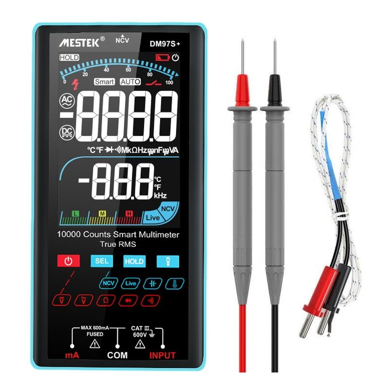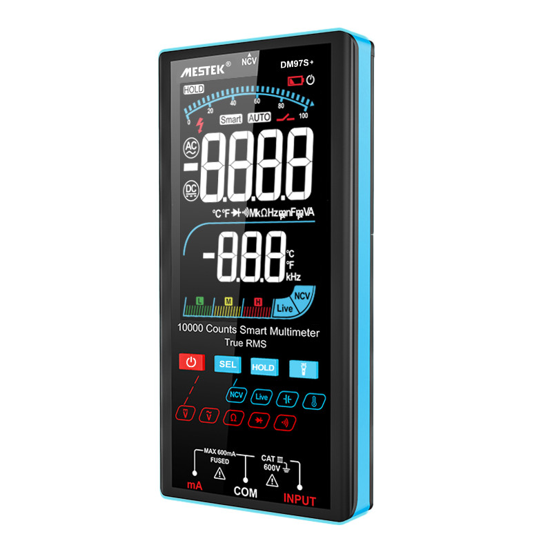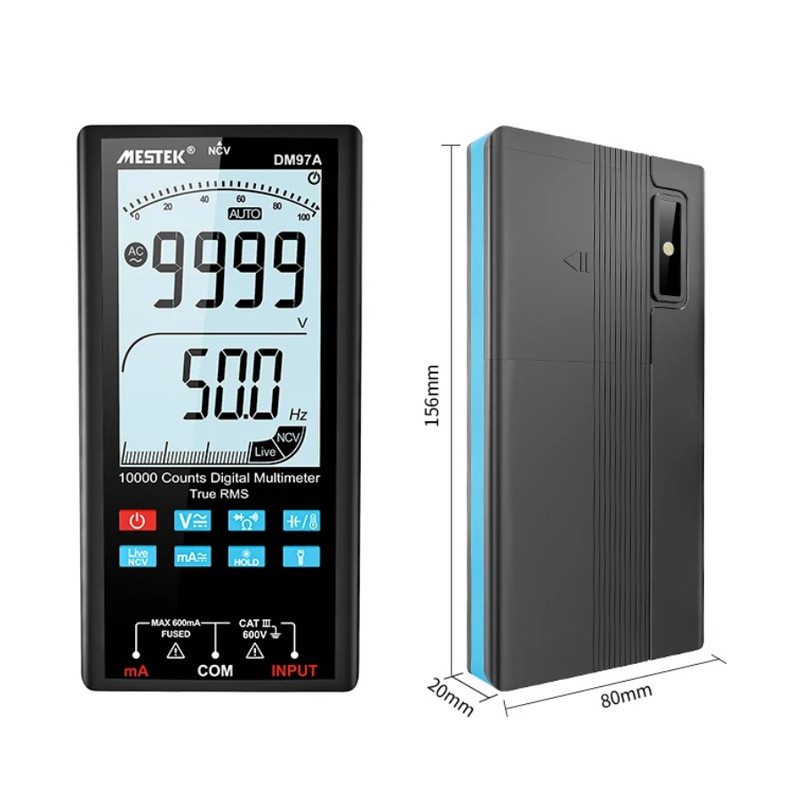 مولتی متر دیجیتالی مستک مدل DM97S+ یک مولتیمتر هوشمند با صفحه نمایش رنگی و بزرگ 10000 شمارشی میباشد که قابلیت اندازه گیری ولتاژ DC به میزان 600 ولت, ولتاژ متناوب به میزان 600 ولت, جریانDC به میزان 600 میلی آمپر, جریانAC به میزان 600 میلی آمپر, مقاومت: 0-100MΩ , ظرفیت: 100nF-100Mf و فرکانس: 40-400 هرتز را دارد.همچنین این دستگاه قابلیت ذخیره کردن اطلاعات را نیز دارد.این دستگاه توسط شرکت پترو پژوهش خاورمیانه وارد شده است. اگر بخواهیم شما را با مشخصات فنی مولتی متر دیجیتال اتو رنج DM97S+ آشنا کنیم باید گفت که این مولتی متر به عنوان یک ابزار اندازه گیری چند منظوره به شما این امکان را میدهد تا بتوانید اقدام به اندازه گیری ولتاژ، جریان، مقاومت، ظرفیت، دیود و فرکانس قطعات مختلف کنید.