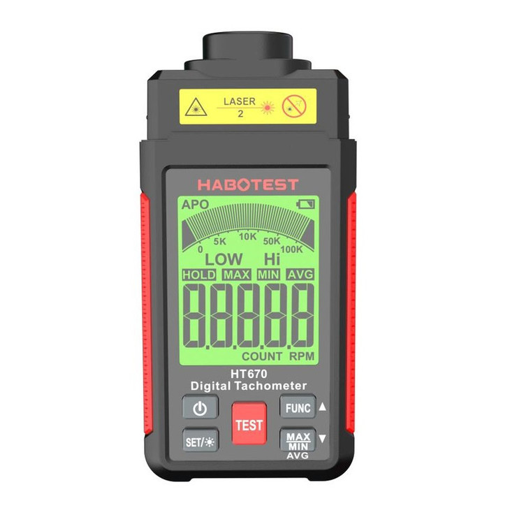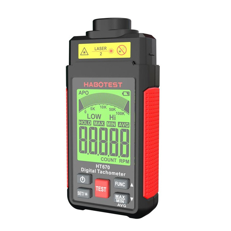 دورسنج دیجیتال لیزری HABOTEST HT670 تاکومتر دیجیتالی جیبی ایمن و قابل اطمینان دارای تنظیم محدوده اتوماتیک که میتواند با دقت بالایی RPM و شمارش را اندازه گیری کند. محدوده RPM مقدار 10 – 9999 RPM و محدوده شمارش این دستگاه 0 تا 99999 می باشد.شما با استفاده از این دستگاه می توانید به راحتی تعداد دور موتور خود را توسط لیزر آن اندازه گیری نمائید کافیست نشانه لیزر را در فاصله 5 تا 20 سانتی متری بر روی مرکز شفت موتور قرار دهید تعداد دور ویا سرعت با توجه به درخواست شما آن را می توان بر روی صفحه نمایش مشاهده نمائید . این دور سنج دارای آلارم هشدار میباشد .