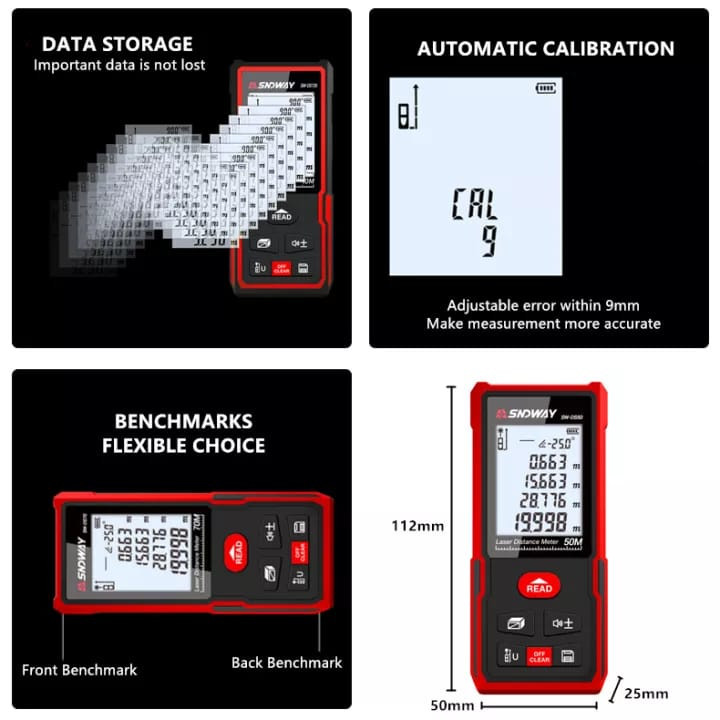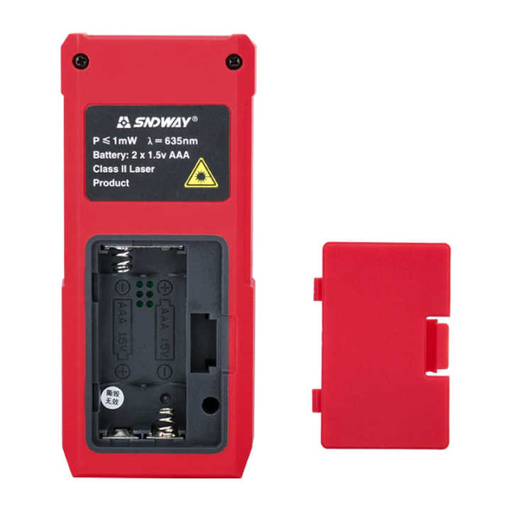 برند سندوی SNDWAY یک برند شناخته شده و خوشنام در تولید ابزارآلات دقیق اندازه گیری و لیزری میباشد. متر لیزری SNDWAY SW-DS100 یکی از جدید ترین محصولات این شرکت می باشد.این متر لیزری با دقت دو میلیمتر دارای کلیه امکانات شامل محاسبه مساحت ، حجم ، فیثاغورث(سه روش مختلف)،تغیر واحد به مییلیمتر،سانتیمتر،فوت و اینچ ،اندازه گیری لایو(ممتد)،اندازه گیری ماکزیمم و مینیمم،صفحه نمایش چهارخطی بزرگ(با چراغ صفحه)،اندازه گیری زاویه(شیب سنج دیجیتالی)،قابلیت ذخیره 30 اندازه گیره(حافظه) و مصرف کم باتری(8000 بار اندازه گیری) و قابلیت خاموش شدن اتوماتیک چراغ صفحه ، نور لیزر(20 ثانیه) و خود دستگاه(150 ثانیه) میباشد.همچنین این متر ضد رطوبت و ضد گرد و غبار میباشد و دارای استاندارد CE و RoHS(استاندارد اتحادیه اروپا)و استاندارد FCC(استاندارد قاره آمریکا)میباشد.
