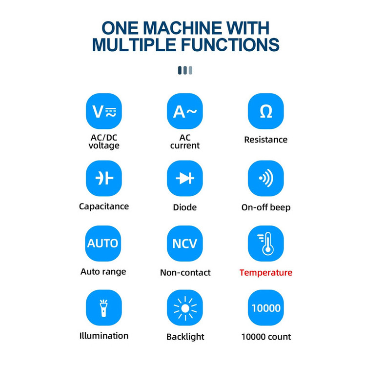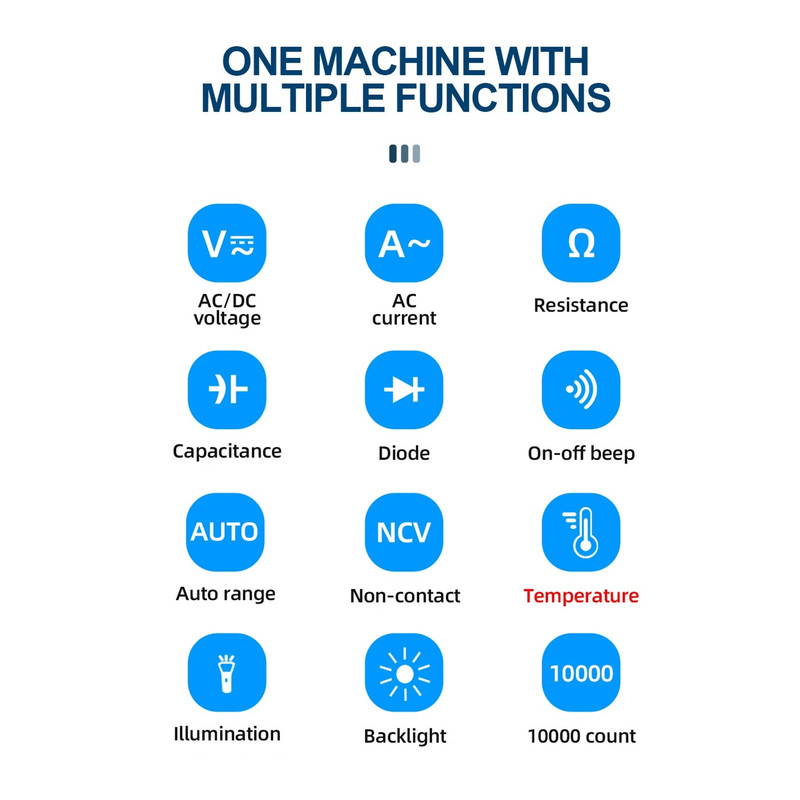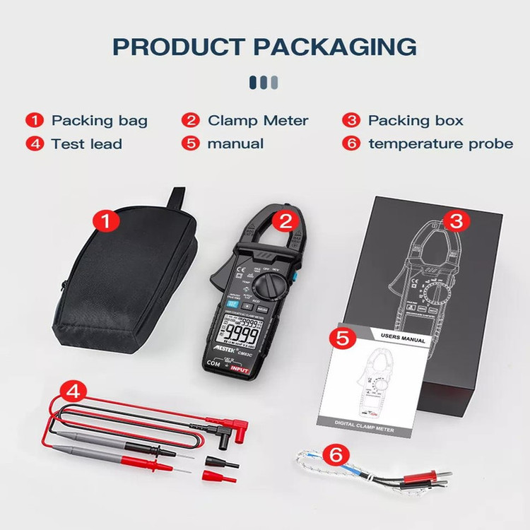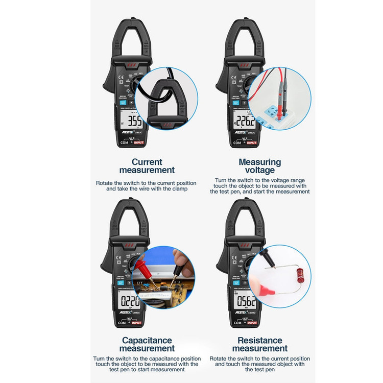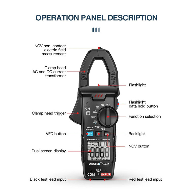 سایر توضیحات : اندازه گیری ولتاژ AC/DC، جریان AC، مقاومت، ظرفیت خازن، فرکانس، چرخه کاری، دیود، تداوم و سیم برق و تست NCV با عملکرد هشدار خاموش شدن خودکار: حدود 15 دقیقه چراغ قوه LED داخلی، مناسب برای استفاده در شب یا محیط تاریک ، دهانه فک: 30 میلی متر