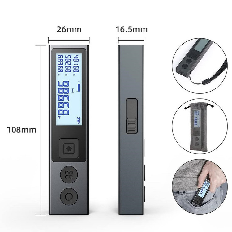 ویژگیهای متر لیزری: صفحه نمایش 3خطی , واحد اندازهگیری فوت , واحد اندازهگیری متر , واحد اندازهگیری اینچ , قابلیت خاموش شدن خودکار , قابلیت اندازهگیری فاصله , قابلیت اندازهگیری حجم , بدون باتری , Class 2