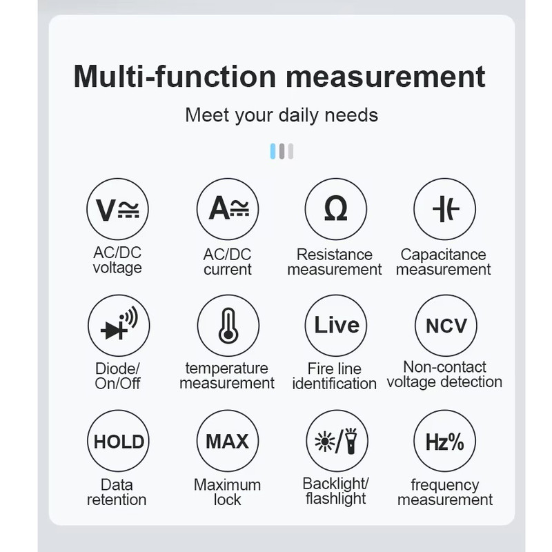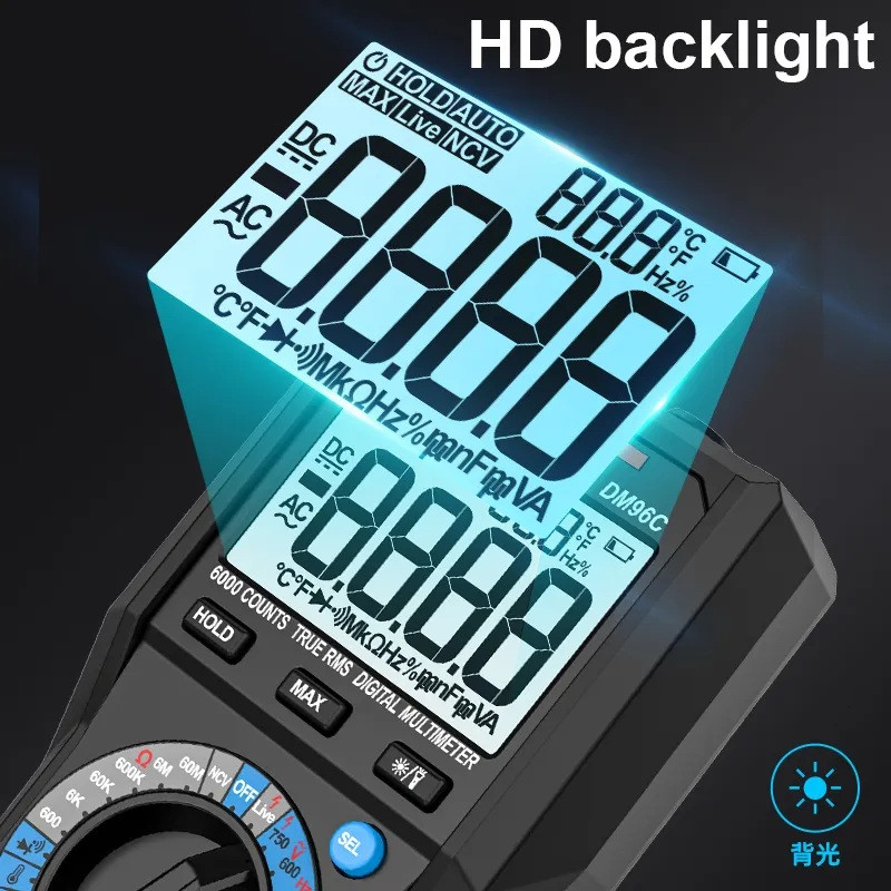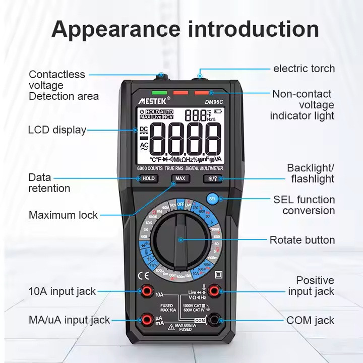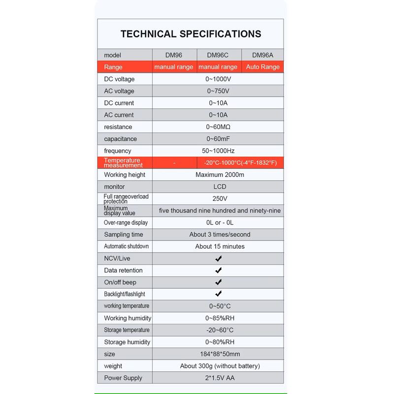 سایر توضیحات : اندازه گیری ولتاژ AC/DC، جریان AC/DC، مقاومت،نمایش تعداد ۶۰۰۰ ، تشخیص ولتاژ AC غیر تماسی. بررسی دیود یا تداوم ، Live تشخیص خط، ظرفیت خازنی، تست سیم برق ، چراغ قوه ، پراب K-Type برای تست TEMP ، ، دارای قاب سیلیکونی بسیار باکیفیت و مقاوم