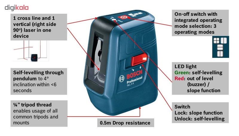 قابلیت ویژه خط سوم جهت گونیا کردن و دیوارها آلارم صوتی در صورت تراز نبودن قابلیت نصب روی سه پایه و پایه مگنت