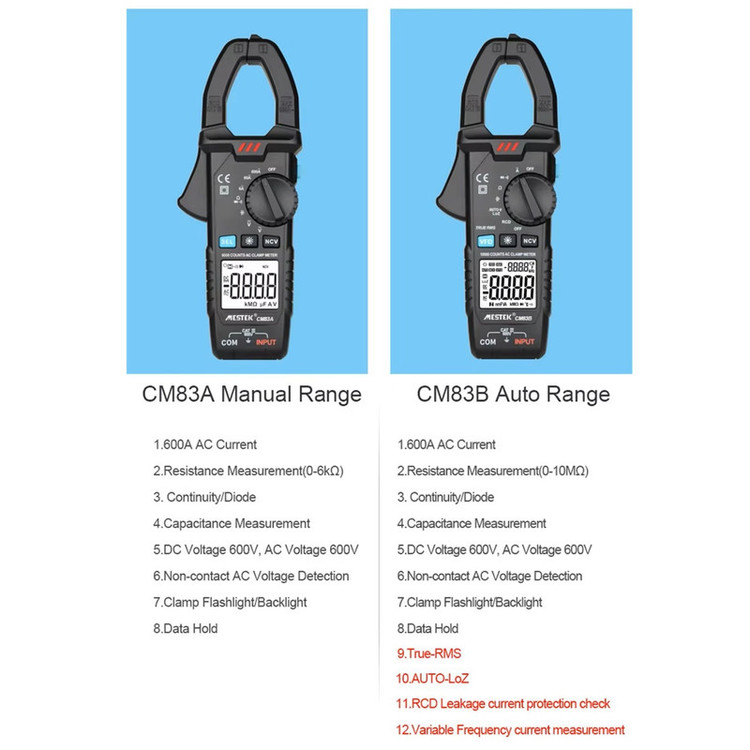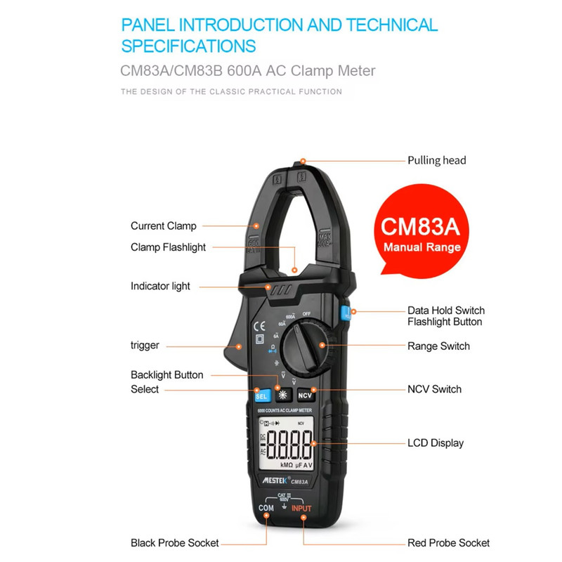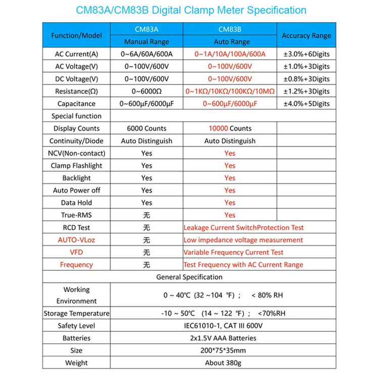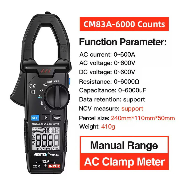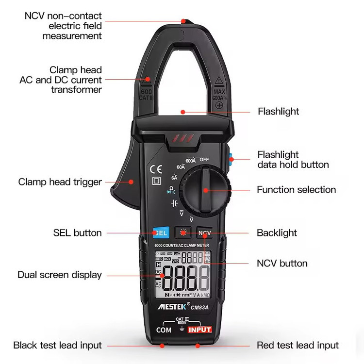 اندازه گیری ولتاژ AC/DC، جریان AC، مقاومت، ظرفیت خازن، دیود، تداوم و سیم برق و تست NCV با عملکرد هشدار خاموش شدن خودکار: حدود ۱۵ دقیقه چراغ قوه LED داخلی، مناسب برای استفاده در شب یا محیط تاریک دهانه فک: ۳۰ میلی متر