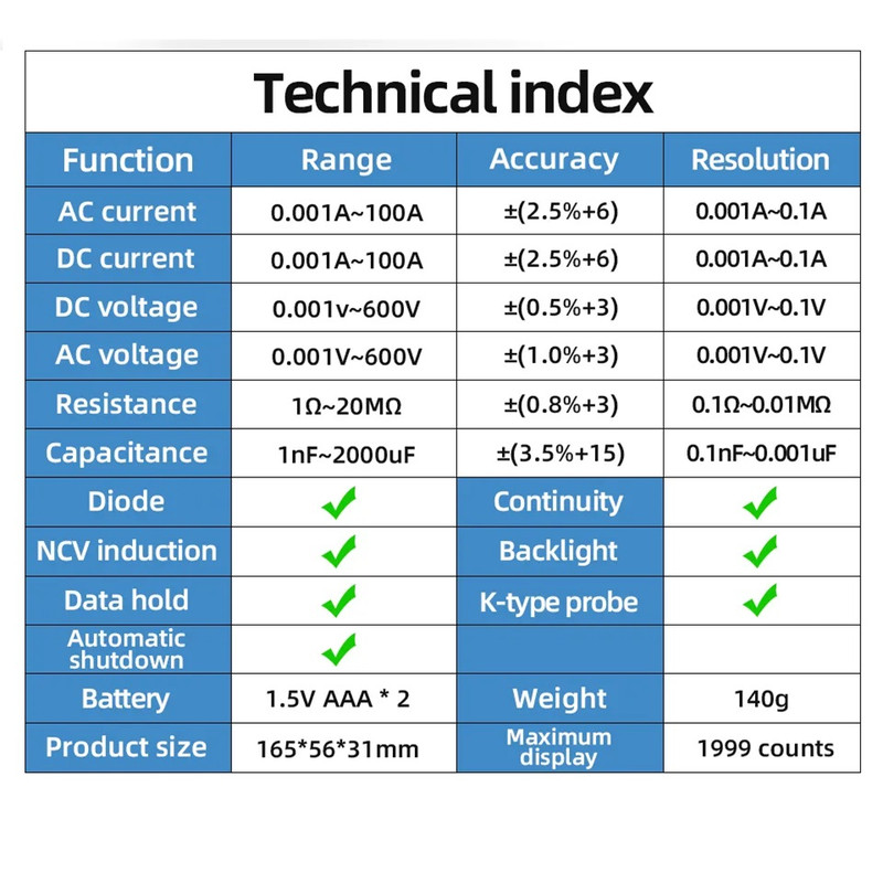 RMS صحیح , تداوم قابل شنیدن , تست خازن , تست دیود , گسترهیابی اتوماتیک