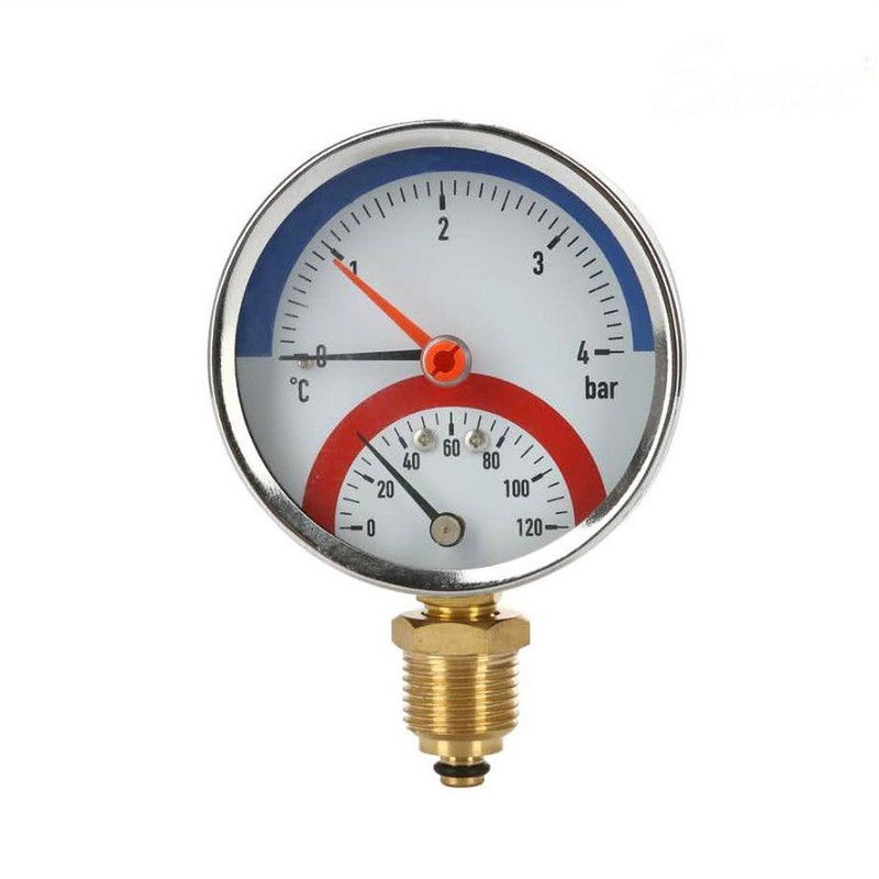 گیج فشار و گیج دما در یک گیج صفحه 8 سانت کانکشن عمودی محدوده دمایی و واحد اندازه گیری : 0 تا 120 درجه سانتی گراد محدوده فشاری و واحد اندازه گیری : 0 تا 6 بار