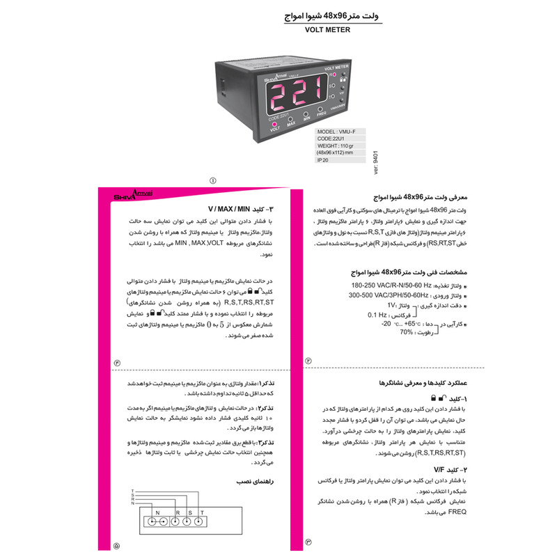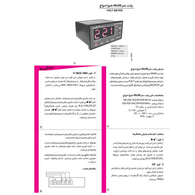 ولتاژ تغذيه : 180VAC-250VAC /R-N/50-60Hz كارآيي در دما : °20- الي °65+ كارآيي در رطوبت : %70 دقت اندازه گيري : ولتاژ : 1V / فركانس : 0.1Hz