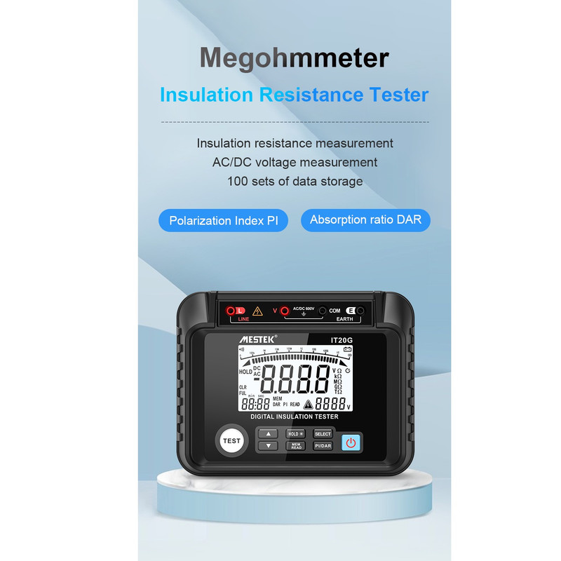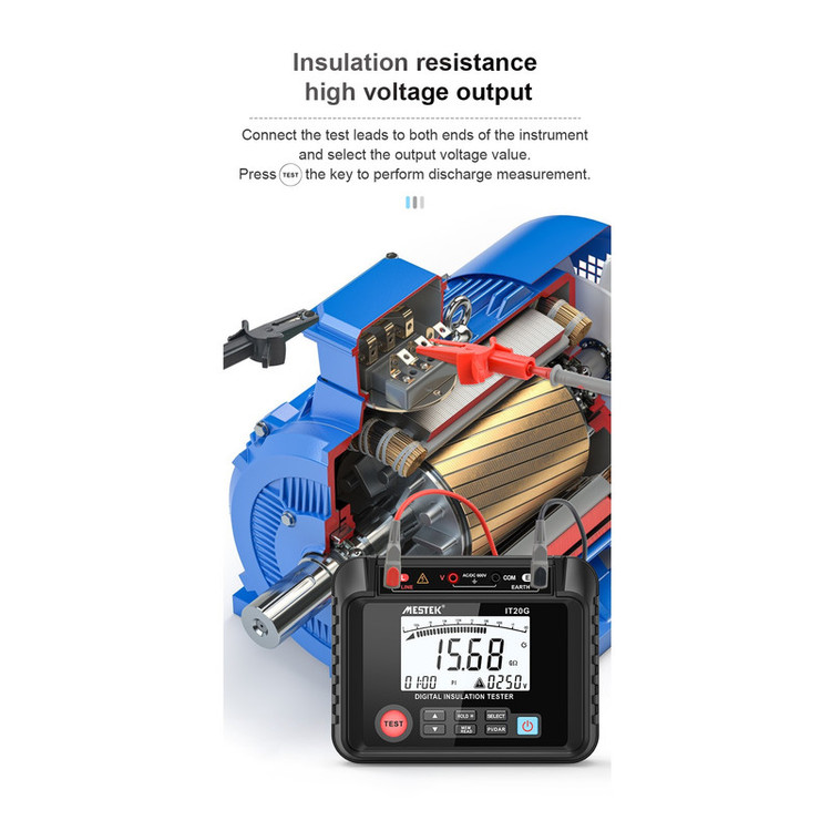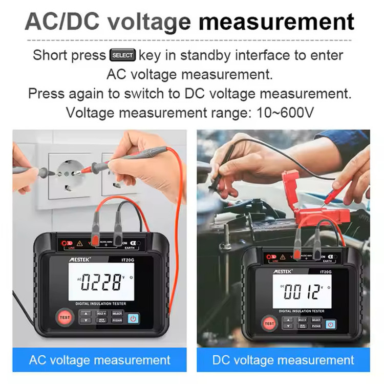 برای تست، سطح ولتاژ مناسب (250V، 500V یا 1000V) را انتخاب می کنید، پرابها را به دو سر تجهیز یا کابل وصل کنید ، دکمه TEST را بزنید تا دستگاه ولتاژ تست را تزریق کند و مقاومت عایقی را روی نمایشگر نشان بدهد.