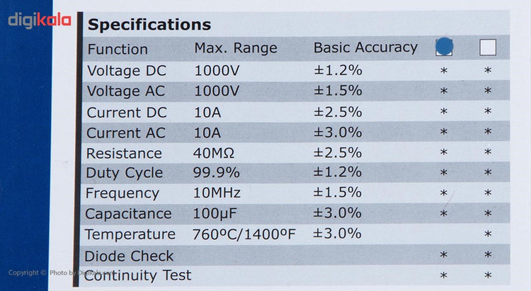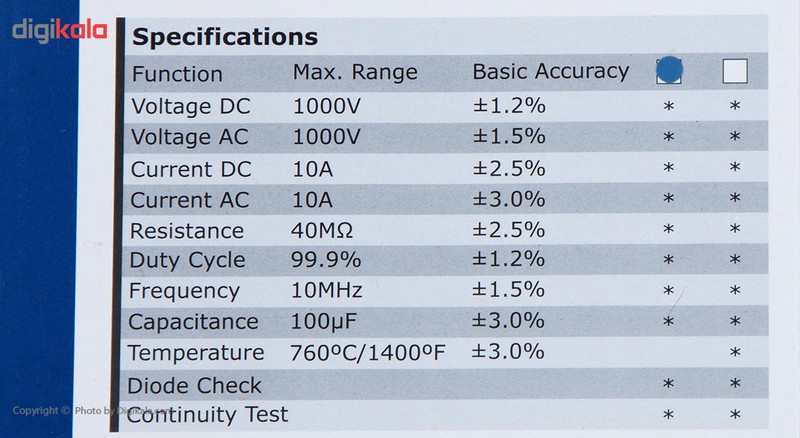 - قابلیت اندازهگیری دما تا 760 درجه سانتیگراد - قابلیت نمایش دما برحسب درجه سانتیگراد و فارنهایت - مقاوم دربرابر آب و گردوخاک - دارای چراغ پسزمینه - قابلیت خاموششدن خودکار