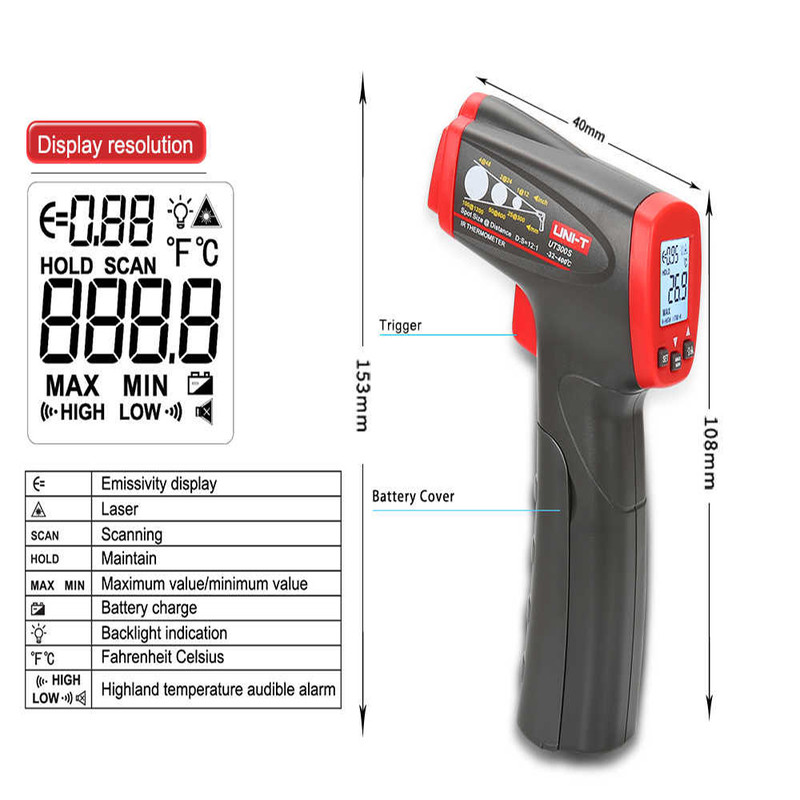 ترمومتر لیزری ۴۰۰ درجه مدل UT-300S محصول برند معتبر یونیتی یک دماسنج مادون قرمز لیزری است که دمای اشیا را تعیین می کند. تابع اصلی آن اندازه گیری دما از راه دور است. UT300S مصرف باتری بسیار کمی دارد و به کاربران کمک می کند تا با سرعت و دقت دما را اندازه گیری کنند. این ترمومتر لیزری دارای بدنه مستحکم و قوی می باشد و نیز استفاده از آن بسیار آسان و راحت و خوش دست است. قیمت این دستگاه نسبت به مدل های مشابه بسیار مناسب است.رنج اندازه گیری دما از 32- الی 400 درجه سانتی گراد می باشد.ویژگی بارز این دستگاه قابلیت تنظیم ضریب باز تابش است که در دقت اندازه گیری بسیار موثر است