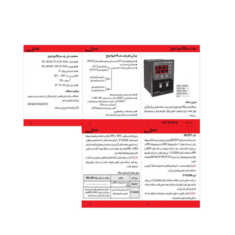 ولتاز تغذیه ۱۸۰-۲۵۰ ولتاژ متناوب،فاز و نول، ۶۰-۵۰ هرتز ولتاژ ورودی ۳۰۰-۵۰۰ولتاژ متناوب،۳فاز،۵۰-۶۰هرتز دقت اندازه گیری ولتاژ:۱ ولت کارایی در دما: ۶۵+..۲۰– و رطوبت : ۷۰درصد ابعاد برش تابلو ۹۱*۹۱میلی متر