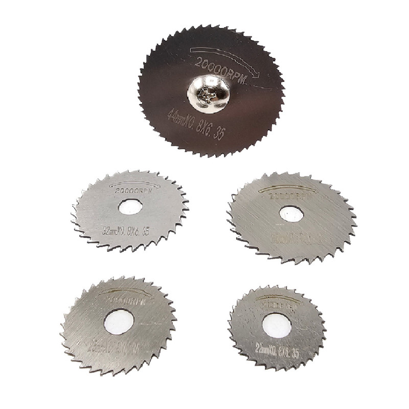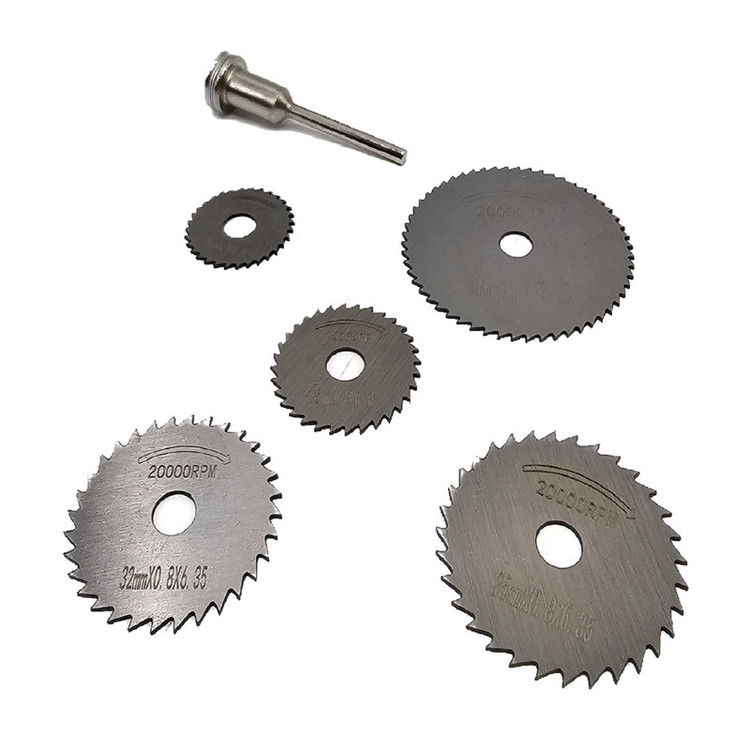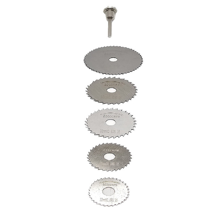 از تیغه های HSS برای برش انواع چوب ، پلاستیک و فلزات نرم و در حجم کم استفاده می شود . محصول فوق مناسب برای برش چوب است. این محصول از 5 تیغه و یک رابط تشکیل شده است که از هریک از تیغهها برای برش چوب در سایزهای مختلف استفاده میشود. از این مجموعه عمدتا برای فرزهای حکاکی مینیاتوری استفاده می شود. ذکر این نکته ضروری است که این مجموعه برای کارهای ظریف مناسب بوده و از آن نمیتوان انتظار برش در حجم و ضخامت بالا را داشت. به دلیل کیفیت ساخت بالا نسبت به نمونه های مشابه، توانسته مشتریان زیادی را برای خود داشته باشد . برای کار با این تیغه ها استفاده از عینک ایمنی توصیه میشود. این محصول دارای 5 تیغه در سایزهای 22، 25، 32، 35 و 44 میلیمتر است. همچنین وزن کلی آن 55 گرم است.