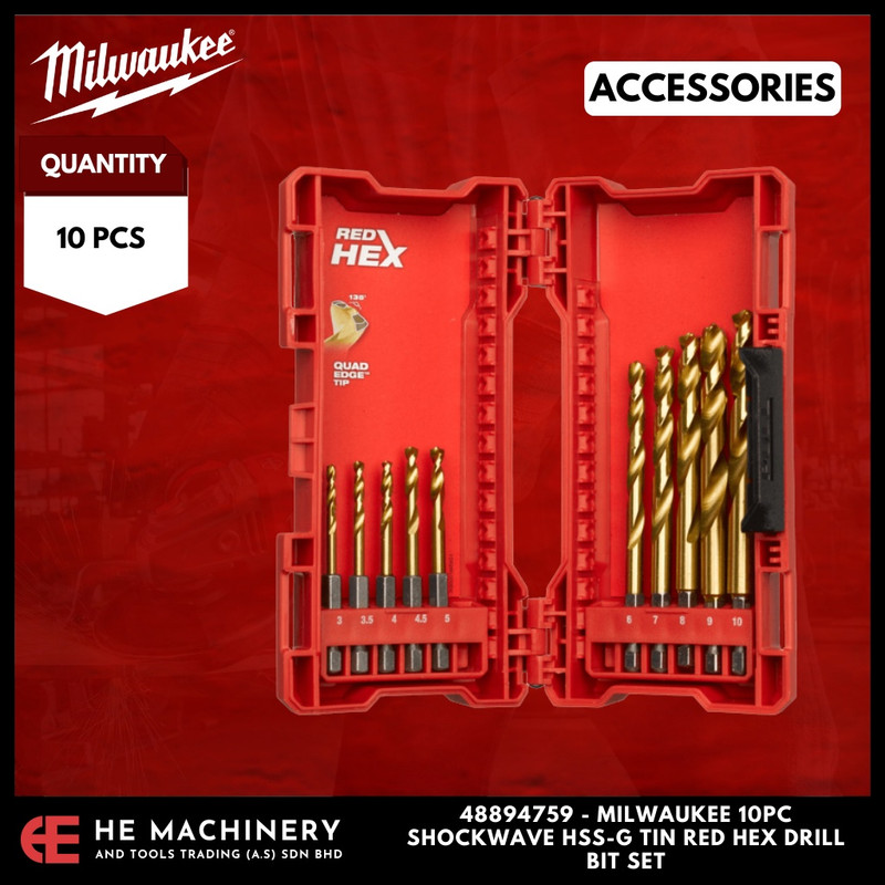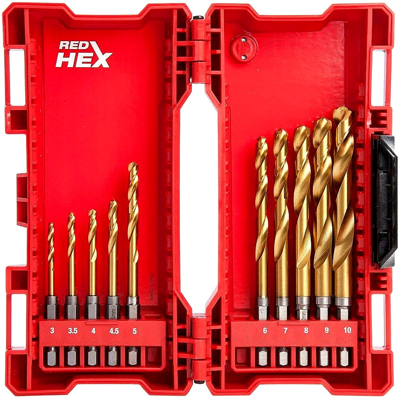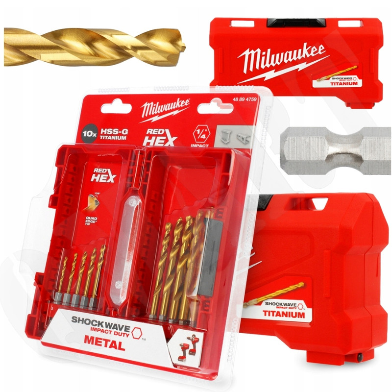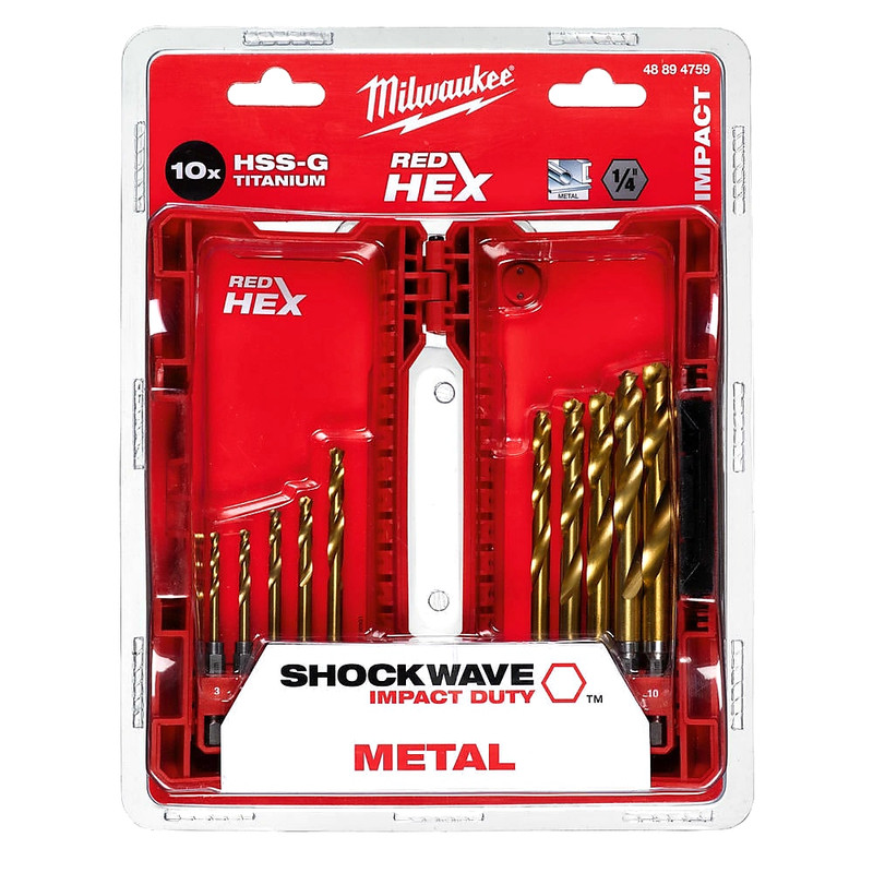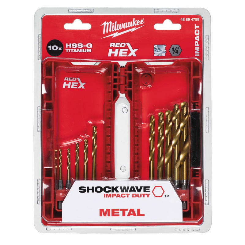 دارای ده عدد مته HSS-G TITANIUM به شماره های 10، 9 ، 8 ، 7 ، 6 ، 5 ، 4.5 ، 4 ، 3.5 ، 3 میلیمتر مته های فوق بدلیل 6 ضلعی بودن انتهای مته (1/4 اینچ) قابلیت کار با انواع دریل های شارژی و همچنین دستگاه های Impact را دارا می باشد .