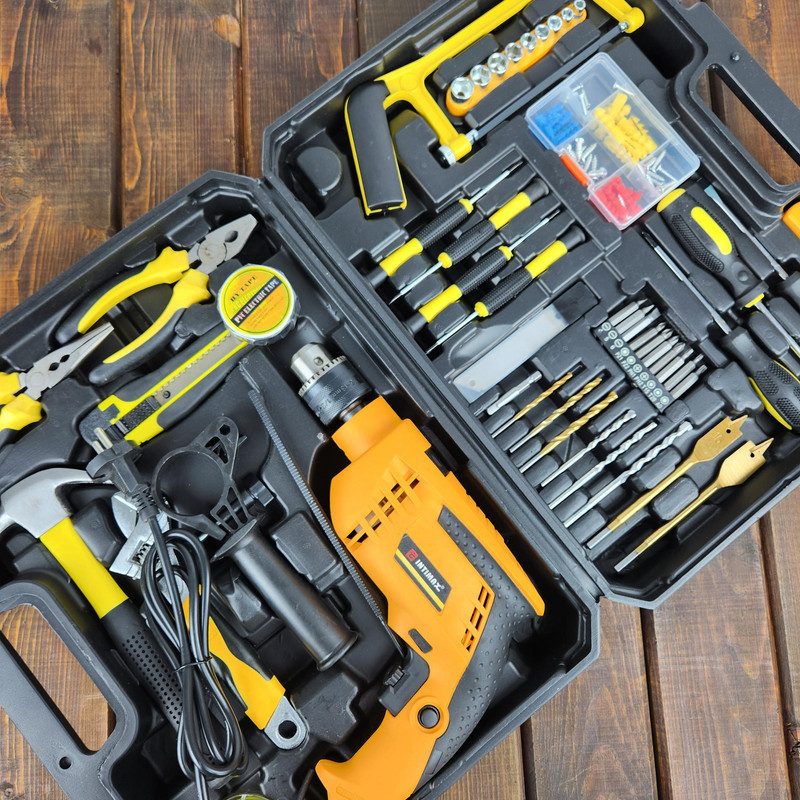 کیت دریل چکشی اینتیمکس یکی از مجموعه هایی می باشد که بیشتر نیاز های کاربران خود را برآورده کرده است این مجموعه ابزار برای کاربری های نیمه صنعتی، تجاری، خانگی بسیار مناسب است . دریل چکشی قرار داده شده در این مجموعه دارای موتور قدرتمند 1200 واتی قرار داده شده و در این دریل سرعت چرخش آزاد 3000-0 دور در دقیقه را به چرخش در می آورد ، همچنین قطر سه نظام این دریل 1.5 الی 13 میلیمتر می باشد. که از ویژگی های منحصر آن می توان به كنترل سرعت (دیمر) گردش با ميزان فشار به شستي، حداکثر توان سوراخ کاری در فلز 13 میلی متر و در مصالح 13 میلی متر و در چوب 30 میلی متر ، دسته کمکی با قابلیت چرخش 360 درجه اشاره کرد . این مجموعه شامل کلیه ابزارهای مصرفی شامل؛ آچار فرانسه ، انبردست، دمباریک، چکش، بکس تک سایز 4 تا 13، متر 3 متری، پیچ گوشتی دوسو و چهارسو سایز بزرگ، پیچ گوشتی نوک خور،، مته آهن سایز 4 و 5 و 6، مته دیوار سایز 5 ،6 و 4، مته برگی سایز 16و 20، 9 عدد نوک پیچ گوشتی،تبدیل نوک پیچ گوشتی به بکس چسب برق، کاتر، فازمتر دیجیتال، آچار سه نظام،5 عدد تیغ کاتر، دو سایز پیچ گوشتی موبایلی دو سو و دو سایز پیچ گوشتی موبایلی چهارسو،کمان اره چوب و فلز، مجموعه سایزبندی پیچ و رولپلاک می باشد .