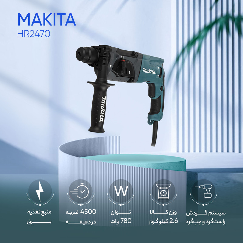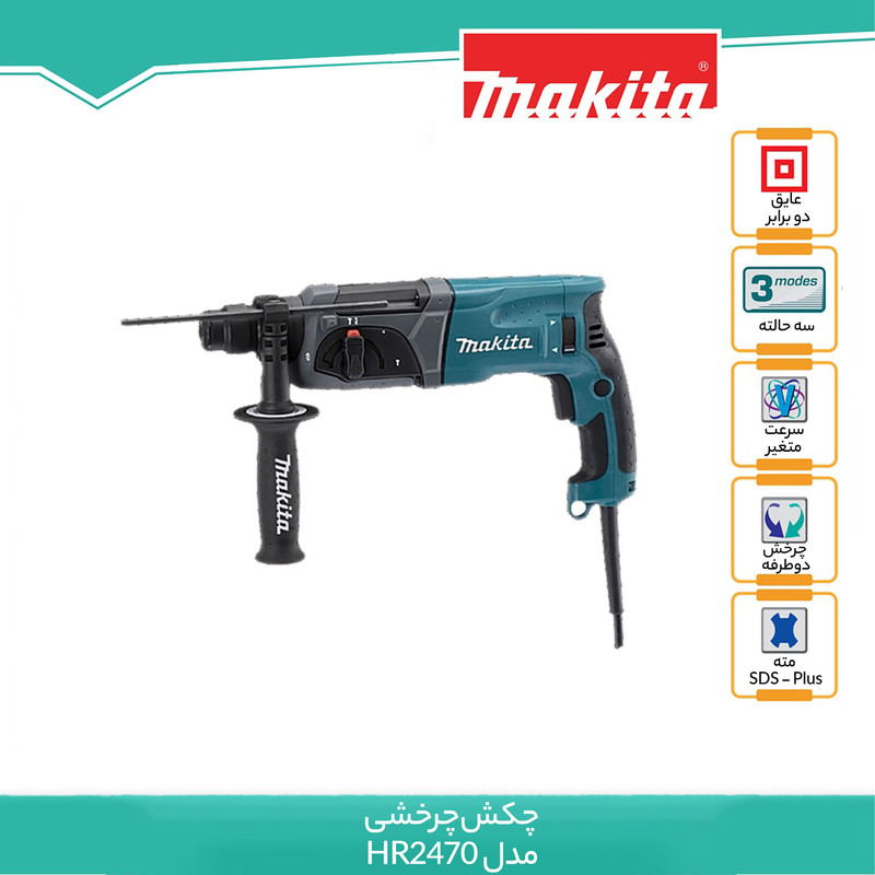 شرکت Makita با ارائه مدل HR2470 سعی بر جلب نظر مشتریان خود برای انتخاب این دریل جهت کار در شرایط صنعتی کرده است. این مدل با وزن 3 کیلوگرم و ابعاد 21.5×8.5×39.5 سانتیمتر، یک دریل ضربهای با قدرت 780 وات است. سرعت این دریل در حالت بدون بار تا 1100 دور بر دقیقه میرسد و دارای قابلیت کنترل سرعت است. این دستگاه هم برای مصارف تجاری و هم برای استفاده در اماکن صنعتی مناسب است و نرخ ضربه آن تا 4500 ضربه در دقیقه میرسد. این دریل توانایی سوراخکاری در چوب، فلز و بتون را دارد و حداکثر قطر سوراخ در این چوب، فلز و مصالح، به ترتیب 32، 13 و 24 میلیمتر است و برای تعویض مته نیازی به آچار ندارد. مدل HR2470 یک دریل معمولی-ضربهای مناسب جهت کار در بسیاری از مشاغل به شمار میآید. دریلهای برقی مختلفی در مدلها و طرحهای مختلف، توسط شرکتهای معتبر و جویای نام، تولید و به بازار عرضه شدهاند. مسلما این مدلها باهدف تأمین نظر مشتری و باقابلیتهای مختلف طراحی و تولید میشوند. خریدار با در نظر گرفتن مشخصاتی چون اندازه، قدرت و لوازم جانبی دستگاه در کنار شکل ظاهری و برند آن، اقدام به انتخاب و خرید دریل برقی موردنیاز خود میکند. در خصوص دریلهای چکشی و ضربهای که بیشتر برای امور صنعتی کاربرد دارند نیز به همین روال عمل میشود. بهخصوص کسانی که در مشاغلی چون آهنگری، کارگاههای ساختمانی و کار با بتون و مشتقات آن هستند، برای خرید دریل مورداستفاده خود، جدای از مشخصههایی که ذکر شد به دنبال دستگاهی کارآمد و پرتوان هستند که در کنار قدرت و سرعت مناسب، عمر طولانی داشته باشد. نکته مدنظر این افراد غالبا قدرت ضربه و عملکرد مناسب دستگاه در ساعات کار طولانی و پشت سر هم است. هرقدر دریل توانایی تحمل کار در این شرایط را داشته باشد، بیشتر موردتوجه کاربران و متقاضیان قرار میگیرد.