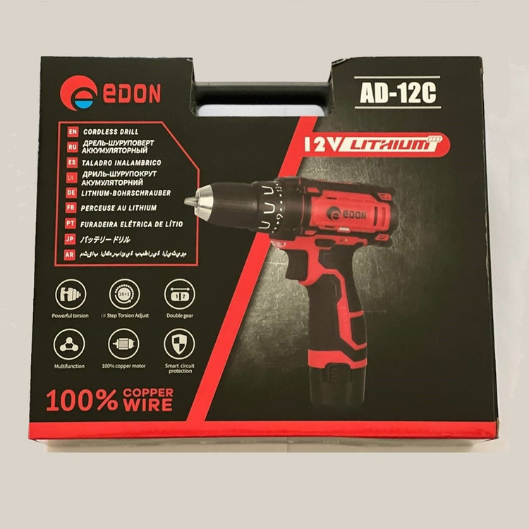 دریل پیچ گوشتی شارژی 12 ولت ادون مدل AD-12C دارای دو باطری بوده و حداکثر قطر مته متصل به سه نطام یکی از ویژگی های مهمی است که کابران همواره به آن توجه می کنند. این پیچ گوشتی شارژی از یک سه نظام خودکار 10 میلیمتری بهره می برد و انرژی مورد نیاز این دریل از طریق یک باطری لیتیومی-یونی با ظرفیت 1.5 آمپرساعت تامین میشود. همچنین ادون همراه با این دریل یک باطری اضافه و کیف، سر پیچ گوشتی دوسو،چهارسو، قرار داده است تا کاربران خود را از هرلحاظ بی نیاز سازد و از دیگر ویژگی های این پیچ گوشتی شارژی دارای نشانگر مقدار باطری و ُقابلیت کنترل سرعت و راست گرد , چپ گرد آن می توان اشاره کرد، حداکثر قطر سوراخکاری در فولاد 10ميلي متر و در چوب 10 میلیمتر است .