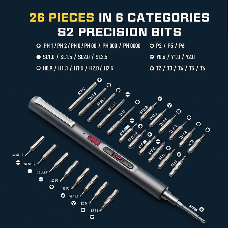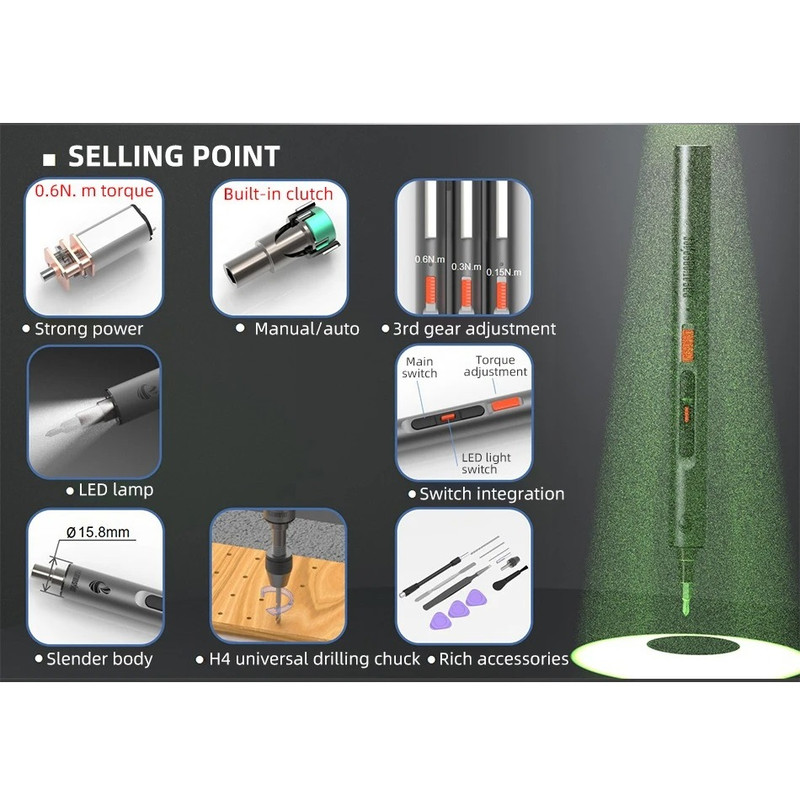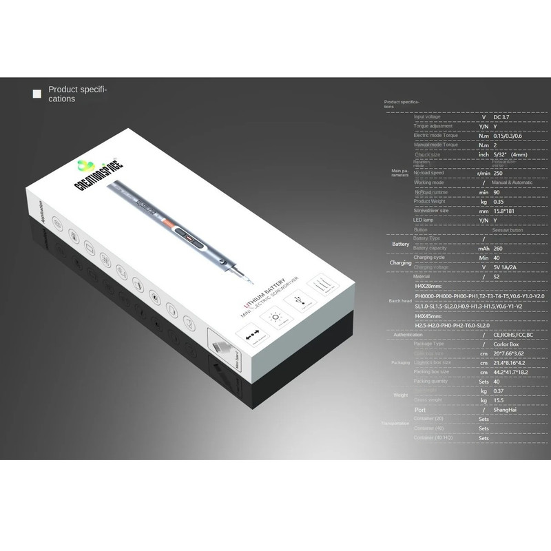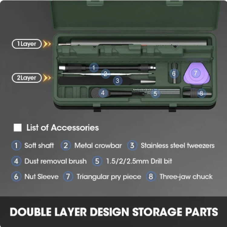 1 عدد پیچ گوشتی شارژی 26 عدد سرپیچ گوشتی 1عدد دستی 1 عدد کابل USB 3 عدد مته 1 عدد برس 1 عدد چاک سه فکی 1 عدد سوکت 1 عدد Pry Bar 3 عدد بشقاب بالابر 1 عدد شفت انعطاف پذیر گسترده 1 عدد موچین 1 عدد جعبه ذخیره سازی