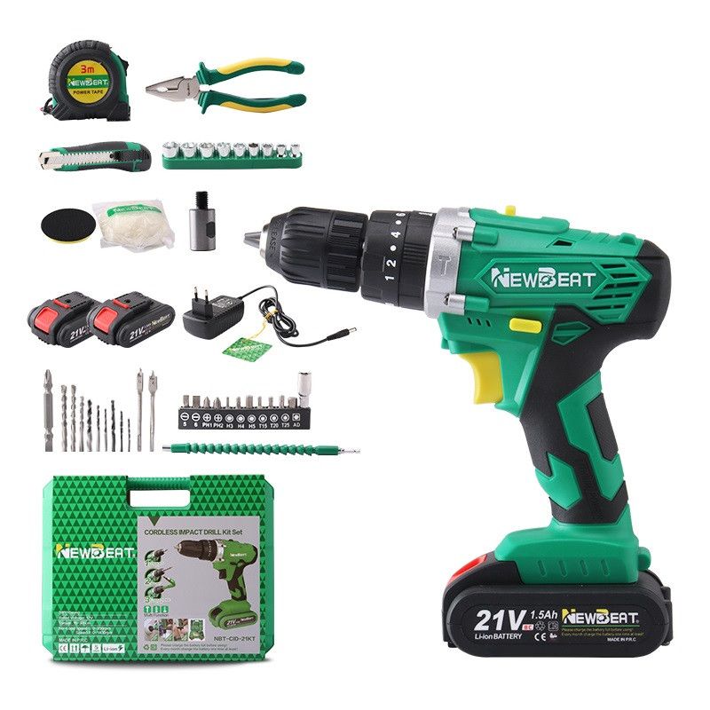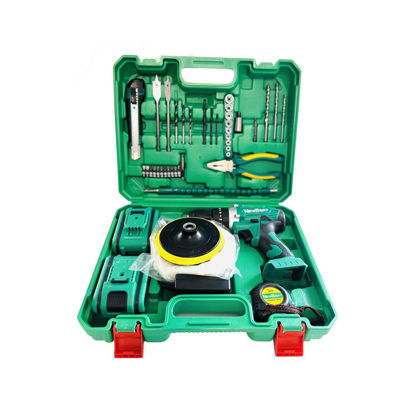 دریل پیچ بند چکشی شارژی نیوبیت با 2 باطری به همراه 44 عدد لوازم شامل 43 عدد لوازم شامل رابط پیچ گوشتی خرطومی به طول 25 سانتی متر، پولیش و پد پولش ، نوک سایز های مختلف چهارسو ، دو سو ، ستاره ای و ... ، 9 عدد مته آهن و دیوار و دو سایز مته برگی ، 9 عدد بکس سایز های مختلف ، انبردست با کیفیت عالی ، متر3 متری با کیفیت ، کاتر ، دو عدد باتری ، شارژر ، دفترچه راهنما می باشد لازم به ذکر است ظرفیت باتری 1500 میلی آمپر ساعت (mAh) و ولتاژ باتری 21 ولت و سایز سه نظام دستگاه 10 میلی متر و اتوماتیک بوده و حداکثر ظرفیت دریل کاری در آهن: 10 میلی متر و در چوب: 22 میلی متر می باشد.این دستگاه دارای حداکثر گشتاور 30 نیوتن متر و دارای کلید چپ گرد و راست گرد است. همچنین دستگاه دارای لامپ LED و کیف BMC می باشد.