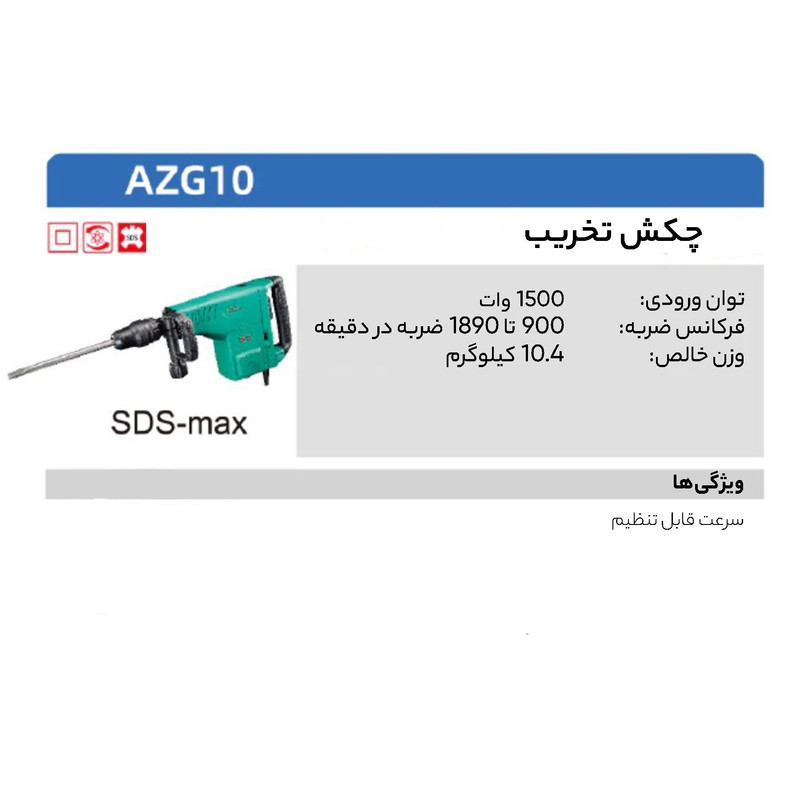 چکش تخریب دی سی ای یک چکش تخریب با توان بالای 1500 وات و قدرت تخریب سریع با ایجاد 1890 ضربه در دقیقه می باشد . این دسنگاه دارای تنظیم کننده سرعت و تثبیت کننده قدرت توسط برد الکترونیکی می باشد .مجهز به دو چراغ LEDنشانگر نیاز به سرویس و تعویض زغال می باشد . مجهز به اورینگ های با کیفیت در سیستم ضربه زن و گیربکس تمام فلزی با اجزاء و دنده های آلیاژ بالا می باشد .AZG 10 مجهز به قلم گیر پنج شیار (SDS MAX) و نیز مجهز به سیستم تنظیم کننده جهت قلم (VARIOLOCK) می باشد .این دستگاه در یک کیف BMC ارایه می گردد .
