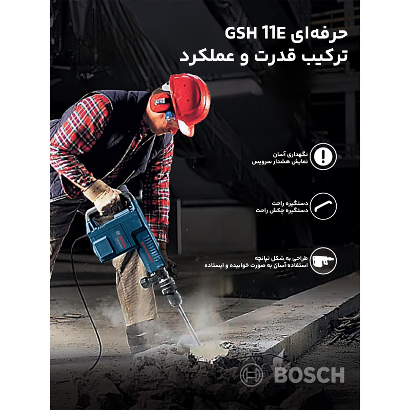 چکش تخریب بوش مدل GSH 11 E ابزاری قدرتمند برای تخریب دیوارها و موارد سخت می باشد و در مشاغلی که با عملیات ساخت و ساز ( معمولا ساختمانی )سروکار دارند کاربرد دارد. این چکش تخریب مجهز به یک موتور قدرتمندی بوده که به خاطر انحصاری بودنن این موتور طول عمر بالایی دارد. موتور این دستگاه با قدرت 1500 وات کار می کند و می تواند در هر دقیقه 900 تا 1890 ضربه وارد کند. یکی از مشخصه های این چکش تعداد ضربات وارد شده توسط چکش تخریب می باشد. چکش تخریببوش مدل GSH 11 E دارای یک دسته با قابلیت چرخش 360 درجه بوده که جهت تسلط بهتر و اعمال نیروی بیشتر به محل سوراخکاری می باشد. این مدل یک ابزار حرفه ای بوده و برای کارهای نفوذ و تخریبی مناسب می باشد. قلم این چکش تخریب از نوع پنج شیار می باشد. این محصول از طراحی خاص و منحصر بفردی بهره برده است. وزن این محصول حدودا 11 کیلو گرم است.