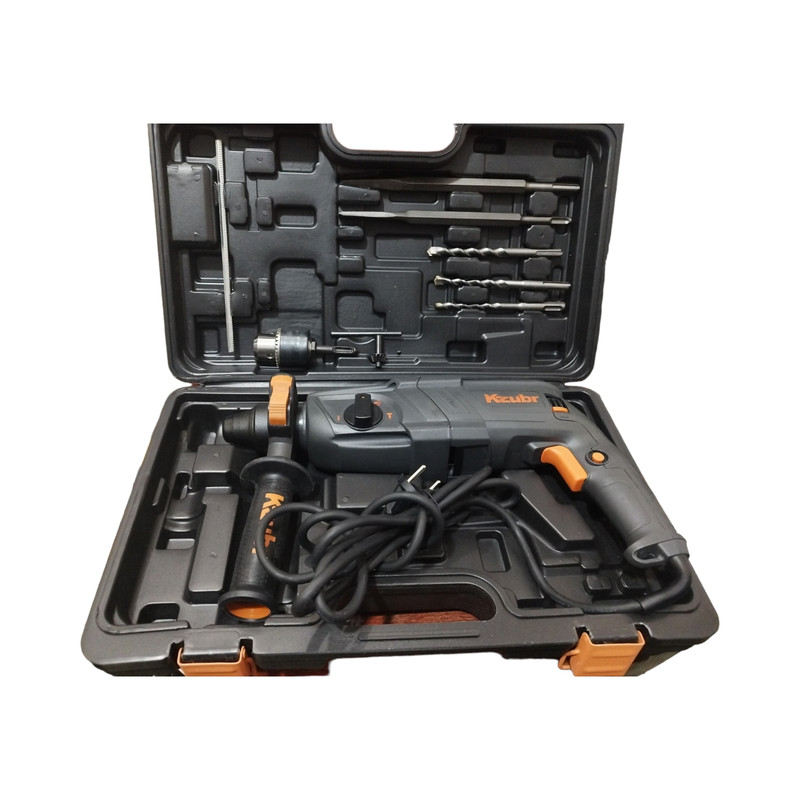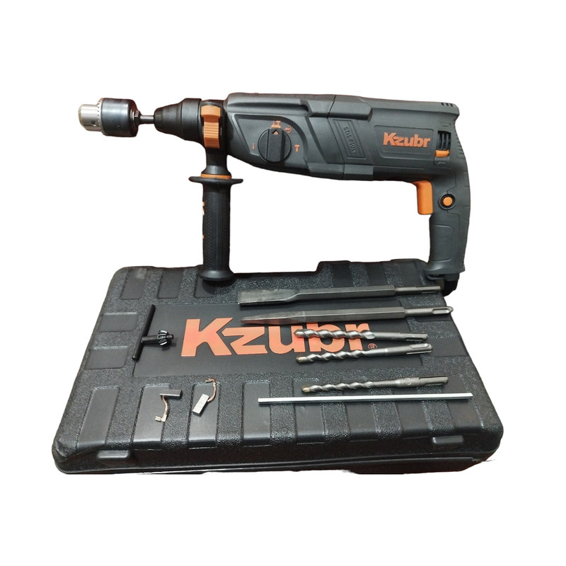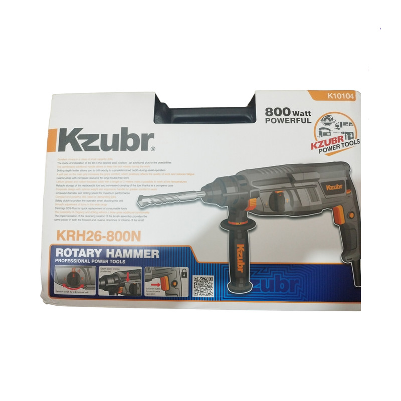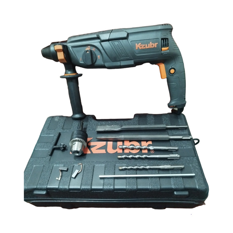 دریل بتن کن زوبر مدل KRH26-800 ساخت شرکت KZUBR Tools است، محصولات این شرکت در سال های اخیر به بازار این وارد شده است که کیفیت محصولات این شرکت به نسبت قیمت آن ها در حد قابل قبولی است. دریل بتن کن سه کاره سه کیلویی زوبر مجهز به موتور پرقدرت 800 وات است که دارای سه حالت عملکرد است. حالت اول چرخش ساده مخصوص سوراخ کاری در چوب و فلز، حالت دوم چرخش همراه با ضربه مخصوص سوراخ کاری در مصالح و حالت سوم تخریب مخصوص تخریب و کندن مصالح است. سه نظام این دستگاه از نوع چهار شیار SDS Plus است و سه نظام آن قابلیت جدا شدن از دستگاه و تعویض ندارد اما با استفاده از یک رابط که در داخل جعبه دستگاه قرار دارد سه نظام چهار شیار تبدیل به سه نظام مخصوص مته ته گرد می شود و از هر دو نوع مته می توان استفاده کرد.