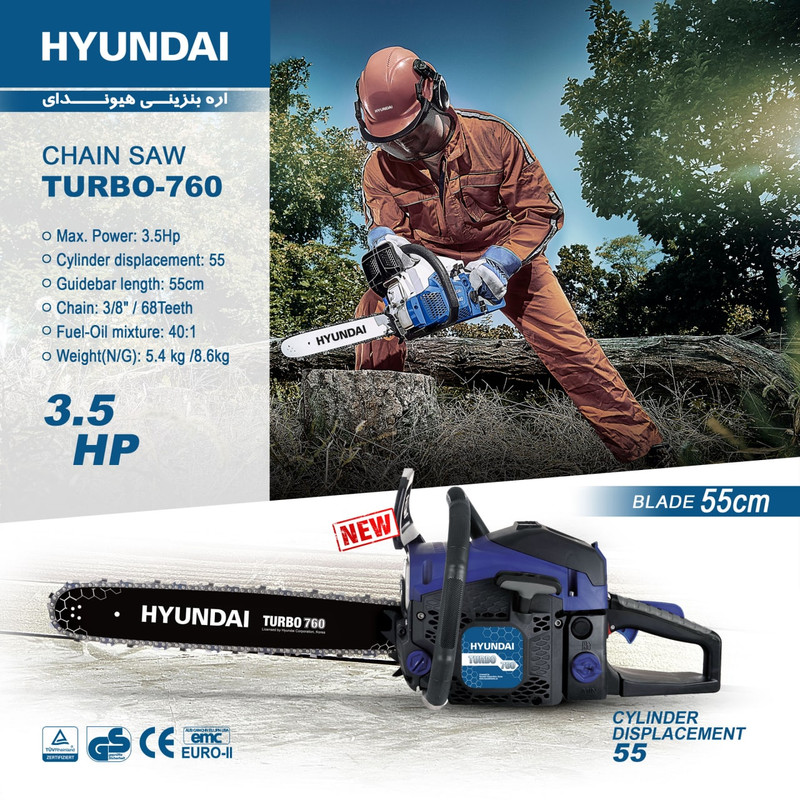تیغه و زنجیر 55 سانتی متری هیوندای حجم موتور 54.6 سی سی حجم باک 560 میلی متر قدرت 2.5 کیلوات 3.4 اسب بخار