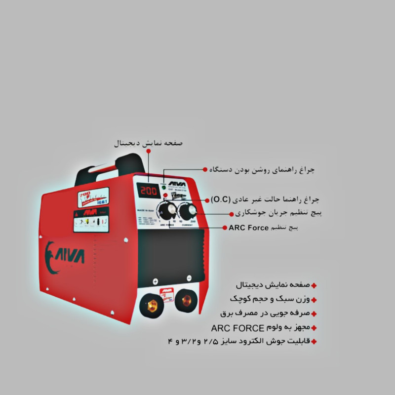 مجهز به صفحه نمایش دیجیتال وزن سبک و حجم کوچک صرفه جویی در مصرف برق مجهز به ولوم ARC FORCE قابلیت جوش الکترود سایز 2/5 و 3/2 و 4 نوع سیستم جوشی IGBT