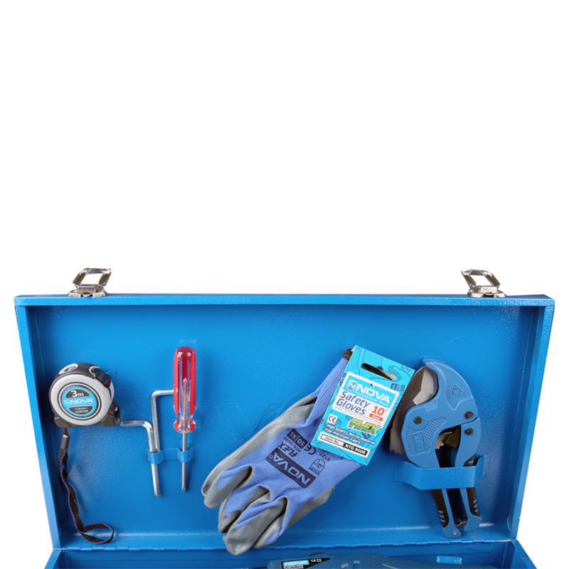 - 6 عدد لقمه 20 میلیمتری ( 2 سری ) ، 25 میلیمتری ( 2 سری ) ، 32 میلیمتری و 40 میلیمتری - 1 عدد صفحه حرارتی اضافه - 1 عدد قیچی PVC بر - 1 عدد متر 3 متری - 1 عدد پیچ گوشتی 4 سو نووآ - 2 عدد آچار آلن - پایه آلومینیومی - کیف فلزی