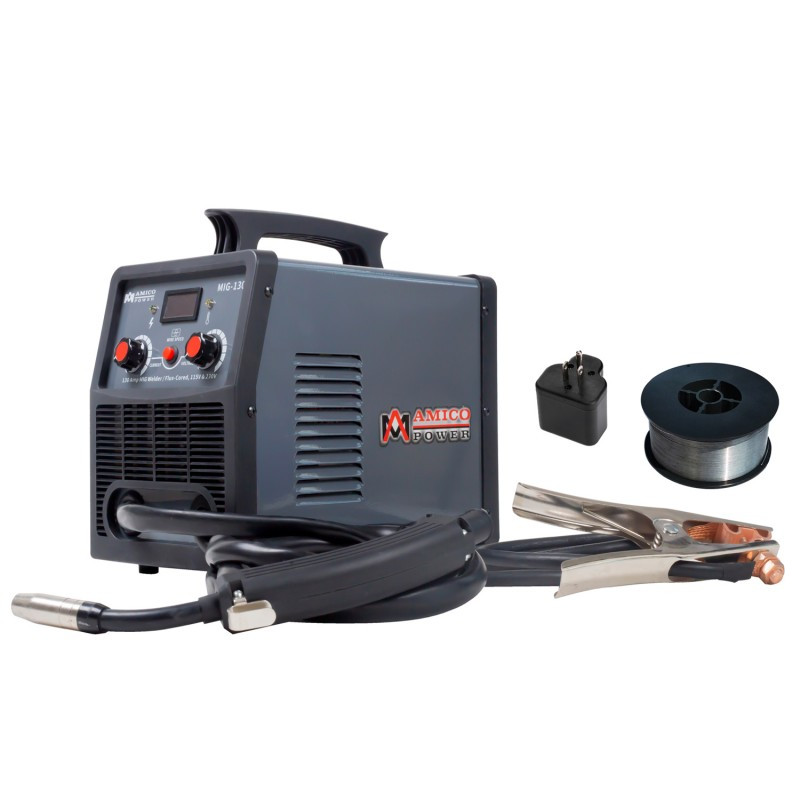 130آمپر تکفاز بدون نیاز به گاز داراي دو ولووم جريان و ولتاژ داراي نمايشگر و كليد سرعت سيم سیستم منبع تغذیه هوشمند دارای فن اتوماتیک داراي تورچ و اتصال و انبر جوش و يك حلقه سيم توپودري ١ كيلويي