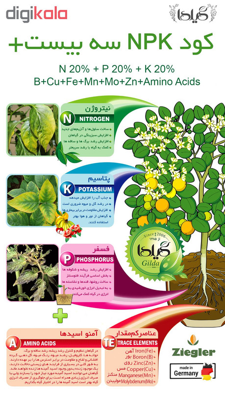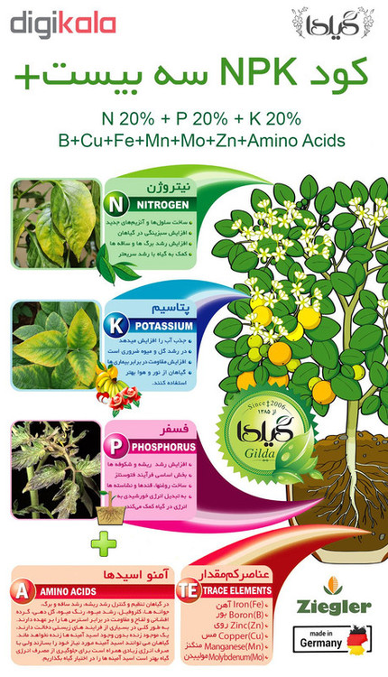 نیتروژن(ازت) 20٪ شامل: نیترات نیتروژن 5.8٪ آنونیوم نیتروژن 4.0٪ اوره نیتروژن 10.2٪ فسفر 20٪ پتاسیم 20٪ TE یا عناصر کم مصرف: آهن روی منگنز بور مس مولیبدن به همراه آمینو اسید