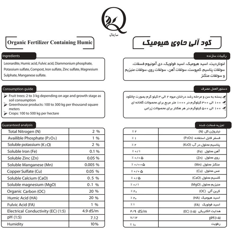 دستورالعمل مصرف: بسته به سن و مرحله رشد درختان میوه 2 الی 3 کیلوگرم بصورت چالکود 100 الی 300 کیلوگرم در 1000 مترمربع برای محصولات گلخانهای 100 الی 500 کیلوگرم در هر هکتار برای محصولات زراعی