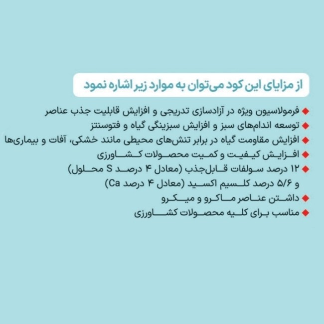 نیتروژن کل (N) 10% فسفر قابلاستفاده (P2O5) 10% پتاسیم محلول در آب(K2O) 10% کلسیم محلول (Ca) 4% گوگرد محلول (S) 4% آهن محلول (Fe) 0.03% روی محلول (Zn) 0.05%