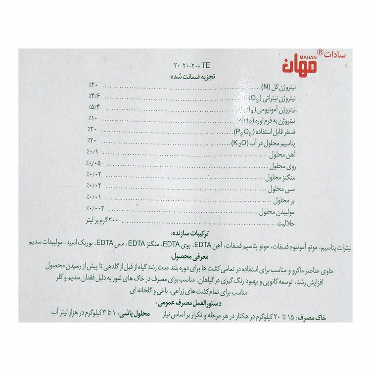 کود کامل NPK 20-20-20 مهان مدل سه بیست وزن یک کیلوگرم