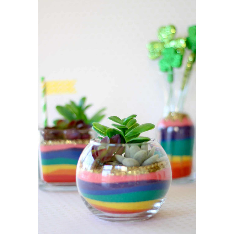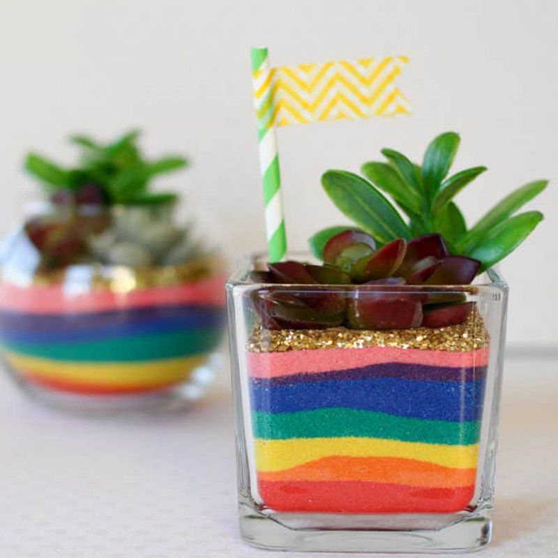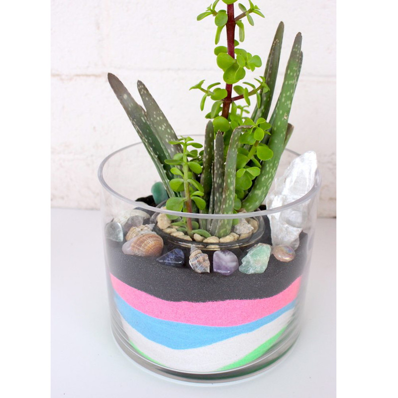 با استفاده از شن و سنگ ریزه های رنگی به راحتی می توانید ظاهر ساده ترین گلدان ها را جذاب تر نمایید.