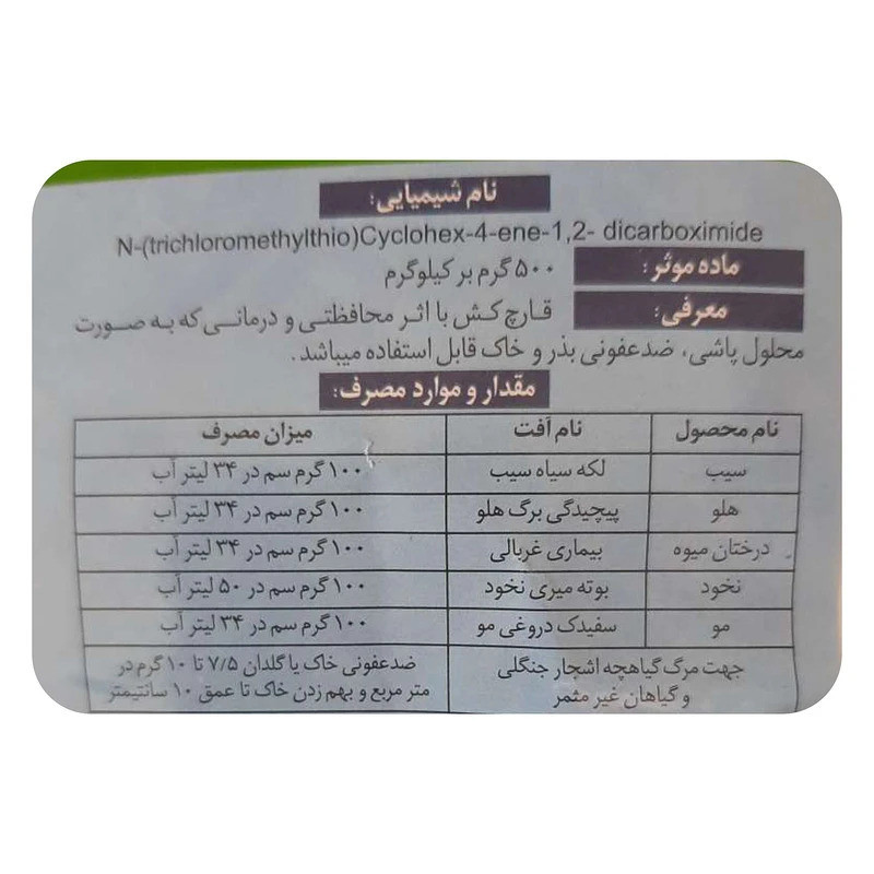 کاپتان 50% (پودر وتابل، WP) مهان در بازار با نام تجاری ارتوساید (Orthocide (WP50% وجود دارد. قارچ کشی با اثر حفاظتی و درمانی که بصورت محلول پاشی، ضدعفونی بذر و خاک قابل مصرف است و به صورت پودر قابل اختلاط با آب برای کنترل طیف وسیعی از قارچها استفاده میشود. این قارچ کش دارای خواص پیشگیری و معالجه کننده است. سم پاشی با این قارچ کش باعث بهبود رنگ و زیبایی میوه ها میشود. دارای ایمنی بالا برای پستانداران و دارای سمیت کمی میباشد. کاپتان یکی از قارچکشهای پرکاربرد حفاظتی با طیف اثر گسترده است که برای کنترل بسیاری از بیماریهای قارچی درختان میوه، گیاهان زراعی و سبزیجات قابل کاربرد میباشد و و در بسیاری موارد بهتر از ترکیبات مسی نتیجه میدهد. فاصله آخرین سمپاشی تا برداشت محصول 10 روز است. جهت ضد عفونی خاک باید خاک تا عمق 10 سانتی متر بهم زده شود. قابل اختلاط با روغنها نبوده و قبل یا بعد از کاربرد روغنها نباید به کار رود. برای کاشت گیاهان پیازی قبل از کاشت پیاز آنها را برای چند دقیقه در محلول کاپتان قرار دهید و سپس بکارید . و سپس می توانید دوباره با کاپتان آبیاری نمایید .