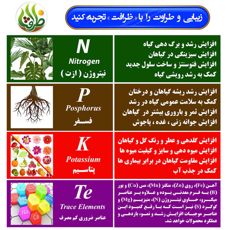 نیتروژن ( N ) ، فسفر ( P ) ، پتاسیم ( K ) و عناصر کلسیم ( Ca ) ، مس ( Cu ) ، منگنز ( Mn ) ، منیزیم ( Mg ) ، روی ( Zn ) ، بر ( B ) , آهن ( Fe )