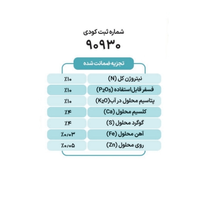 نیتروژن کل 10 درصد فسفر قابل استفاده 10 درصد پتاسیم محلول در آب 10 درصد کلسیم محلول 4 درصد گوگرد محلول 4 درصد آهن محلول 0.03 درصد روی محلول 0.05 درصد