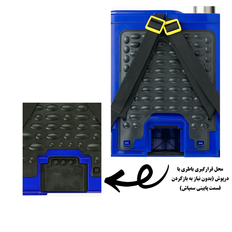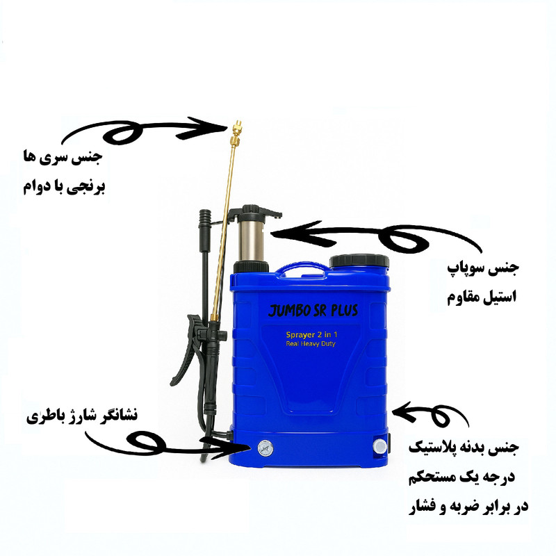 سایر توضیحات : دارای پمپ دستی - دارای پیچ کنترل سرعت - دارای کلید روشن و خاموش - دارای نشانگر ولتاژ - دارای کمربند منعطف برای آویزان کردن بر روی دوش - قابلیت کارکرد به صورت دستی و الکتریکی