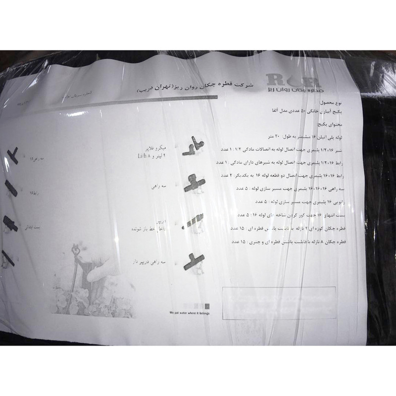محتویات پکیج آبیاری قطرهای محصول شرکت قطره چکان روان ریز (تهران دریپ) مدل ALFA-50 شامل کلیه قطعاتیست که برای آبیاری قطرهای باغچههایکوچک یا گلدانهای تراس منازل به آن نیاز دارید. یک عدد شیر پلیمری که میتواند لوله را به اتصالات مادگی 1.2 متصل کند. سر شلنگی یا رابط 1.2×16 را از سر رزوهدار آن به شیر متصل کرده لوله آبیاری را به دیگر انتهای آن وصل کنید. بهکمک رابطها، سه راهیها و زانوییهای موجود در مجموعه، مسیر (یا مسیرهایی) با لوله مابین گیاهان برقرار کرده، در محل هر گیاه لوله را با شیئی نوک تیز سوراخ کنید و قطرهچکان را در آن سوراخ قرار دهید. با پیچاندن سری قطرهچکانها میتوانید آبدهی آنها را بهدلخواه تنظیم کنید. شعاع آبرسانی این قطرهچکانها بین 5 تا 50 سانتیمتر قابل تنظیم است. دو نوع قطره چکان در این مجموعه قرار داده شده است؛ قطره چکان گلدانی یا کوزه ای دو نازله و قطره چکان هشت نازله. ویژگی ممتاز قطرهچکان گلدانی این است که دو خروجی یکسان 8میلیمتری در دو طرف دارد و این امکان را فراهم میآورد که از یک قطرهچکان برای آبیاری دو گلدان استفاده شود. چنانچه فاصله دو گلدان بیشاز برد پاشش قطرهچکان باشد میتوان به هر یک از نازلها یک شلنگ ماکارونی 8میلیمتر متصل کرد و از طریق آن آب را به پای گلدانها انتقال داد. ویژگی ممتاز قطره چکان هشت نازله نیز این است که پاشش آب در آن به صورت چتری و با نمایی چشمنواز صورت میگیرد.