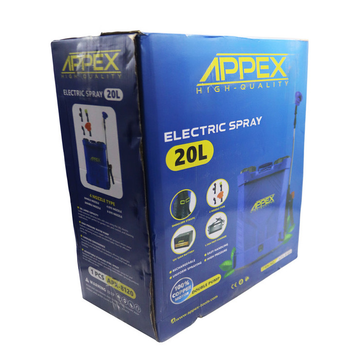 - سمپاش 20 لیتری اپکس - مجهز به دو پمپ قدرتمند ۱۲ولتی بابازدهی بالا میباشد - دارای قابلیت ۳حالته اسپری مه پاش عمودی و افشان میباشد. - دارای مخزن۲۰لیتری ساخته شده از پلاستیک مقاوم و مستحکم است و دربرابر اشعه ماورالبنفش مقاوم میباشد. - کیفیت بالا
