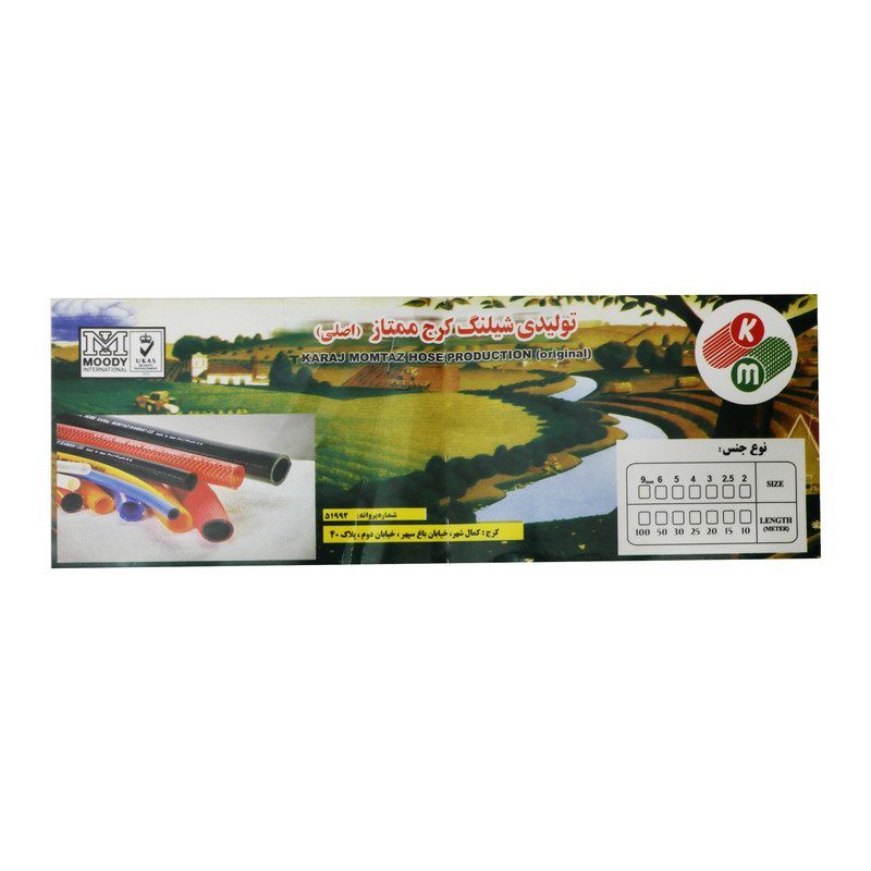 سایر توضیحات: وزن: 10 کیلوگرم، ساخت کشور ایران، محصول کارخانه کرج ممتاز، دارای منجید (نخ پلی استر)، جنس: جداره داخل و جداره بیرونی از مواد نو و لایه میانی نخ پلی استر، سایز: داخلی 1/2اینچ (12 میلی متر)، تعداد لایه: سه جداره، کاربرد: آبیاری، باغبانی، شستشو و نظافت
