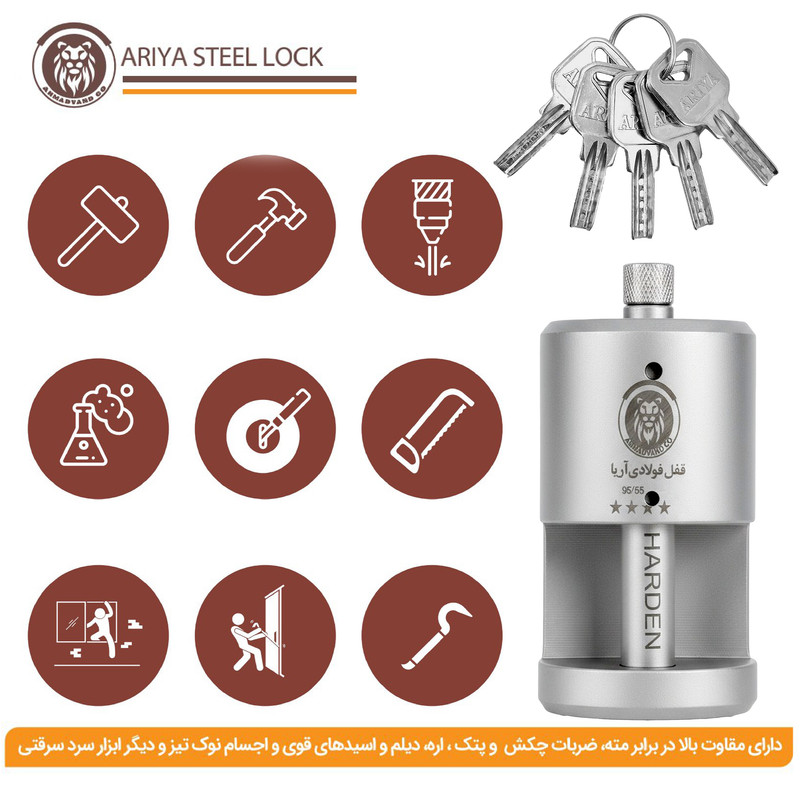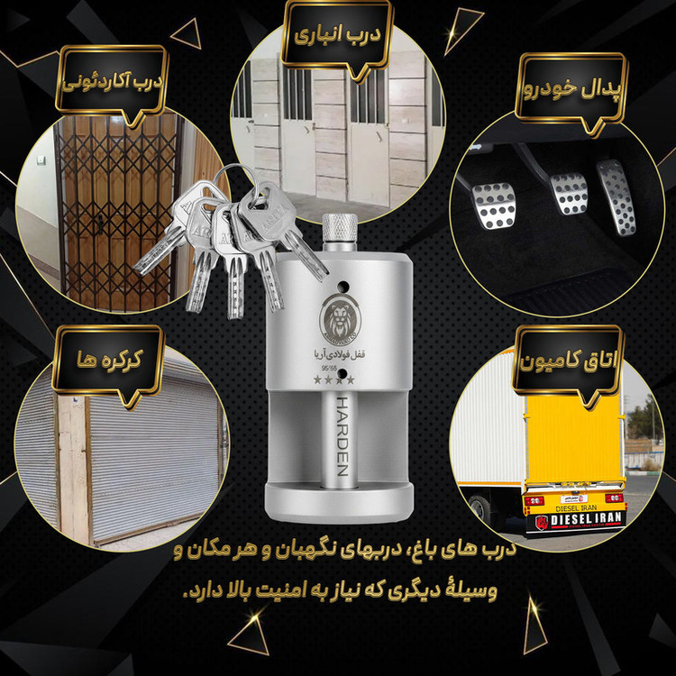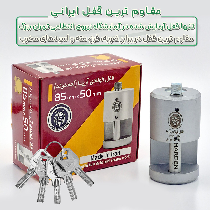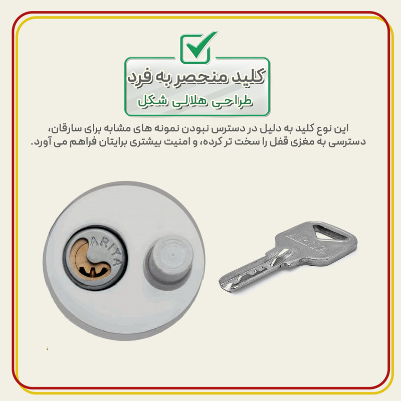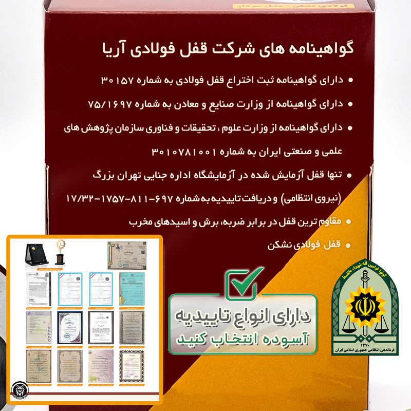 تنها قفل دارای گواهینامه از نیروی انتظامی و اداره آگاهی، تنها قفل ثبت اختراع ملی شده. کلیدهای ناودانی منحصر به فرد که باعث میشوند امنیت قفل در بالاترین حد ممکن باشد.