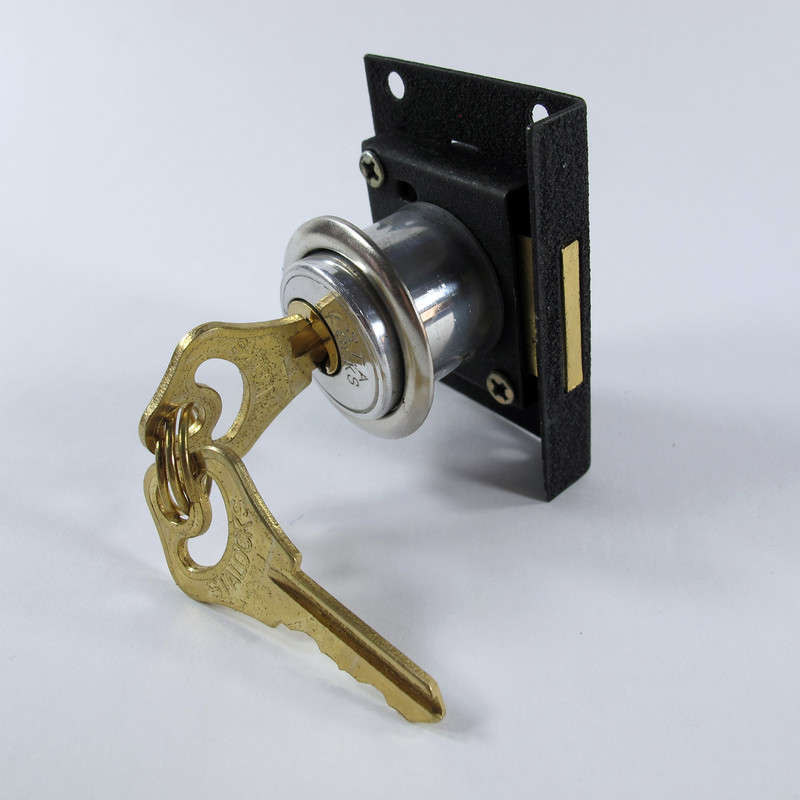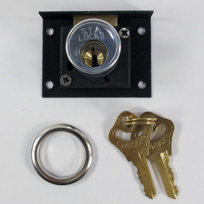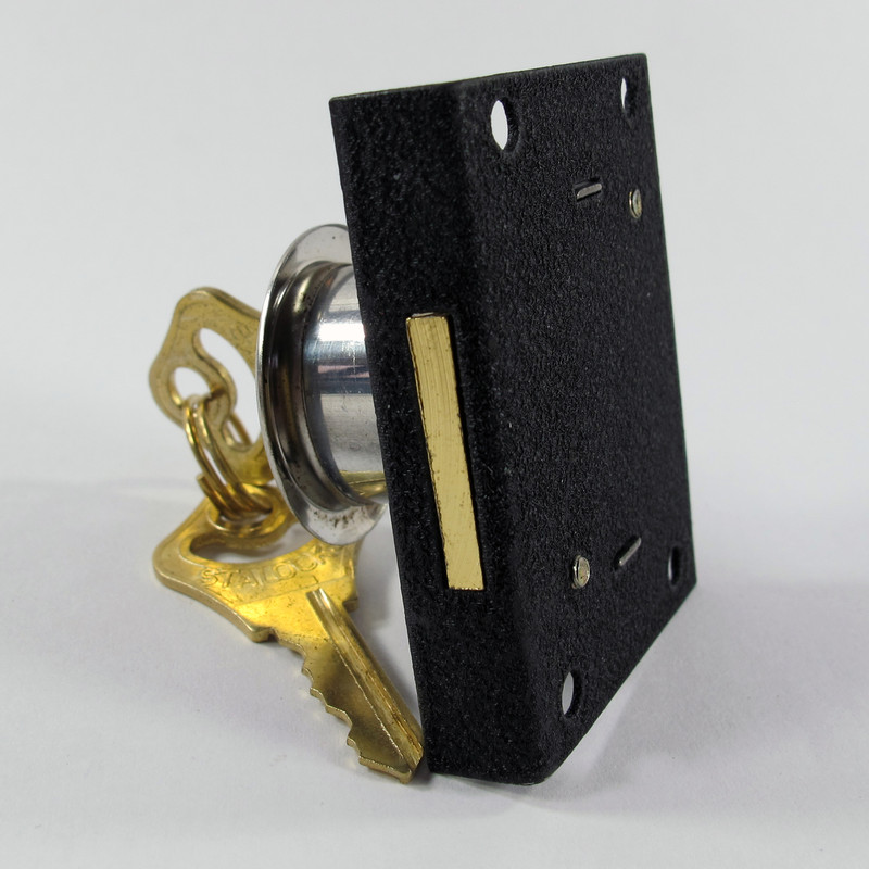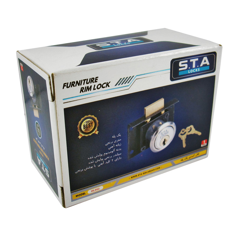 اين محصول قفل کمد يک پله بوده که مغزي قفل از جنس برنج و زبانه قفل از جنس آهن مي باشد. بدنه قفل از جنس آلومينيوم پوليش شده مي باشد. سيلندر قفل ها از جنس برنج پوليش شده است. هر قفل حاوي دو کليد از جنس آهن با روکش از جنس برنج است.