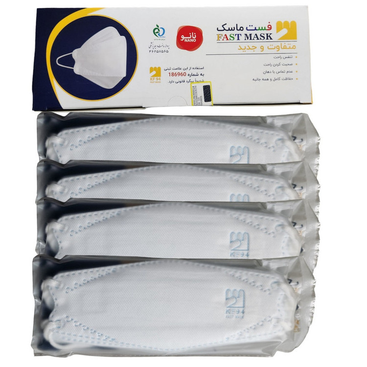 رنگ محصول سفید داخل آبی روشن شش لایه اصلی و با کش های پهن بسته بندی سلفونی با طرح برند فست ماسک بسته بندی 5 تا 5 تا داخل جعبه